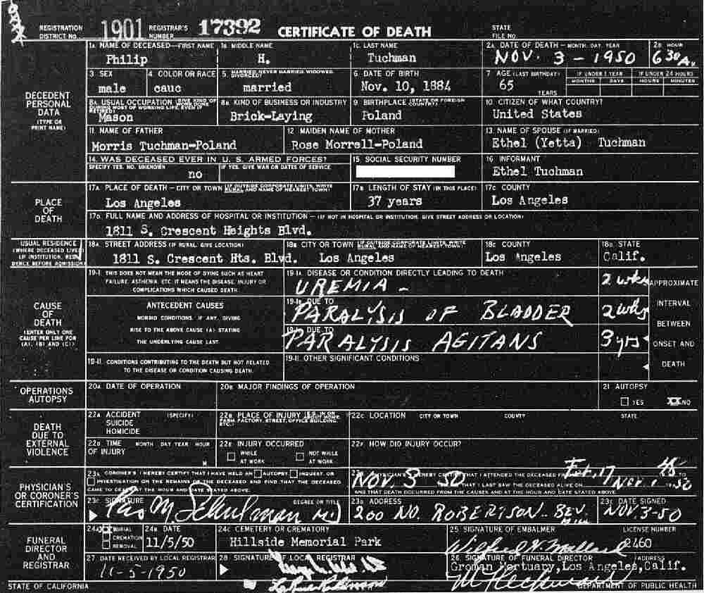 Buried: November 5, 1950 - Hillside Memorial Park, Los Angeles, Los Angeles County, California.