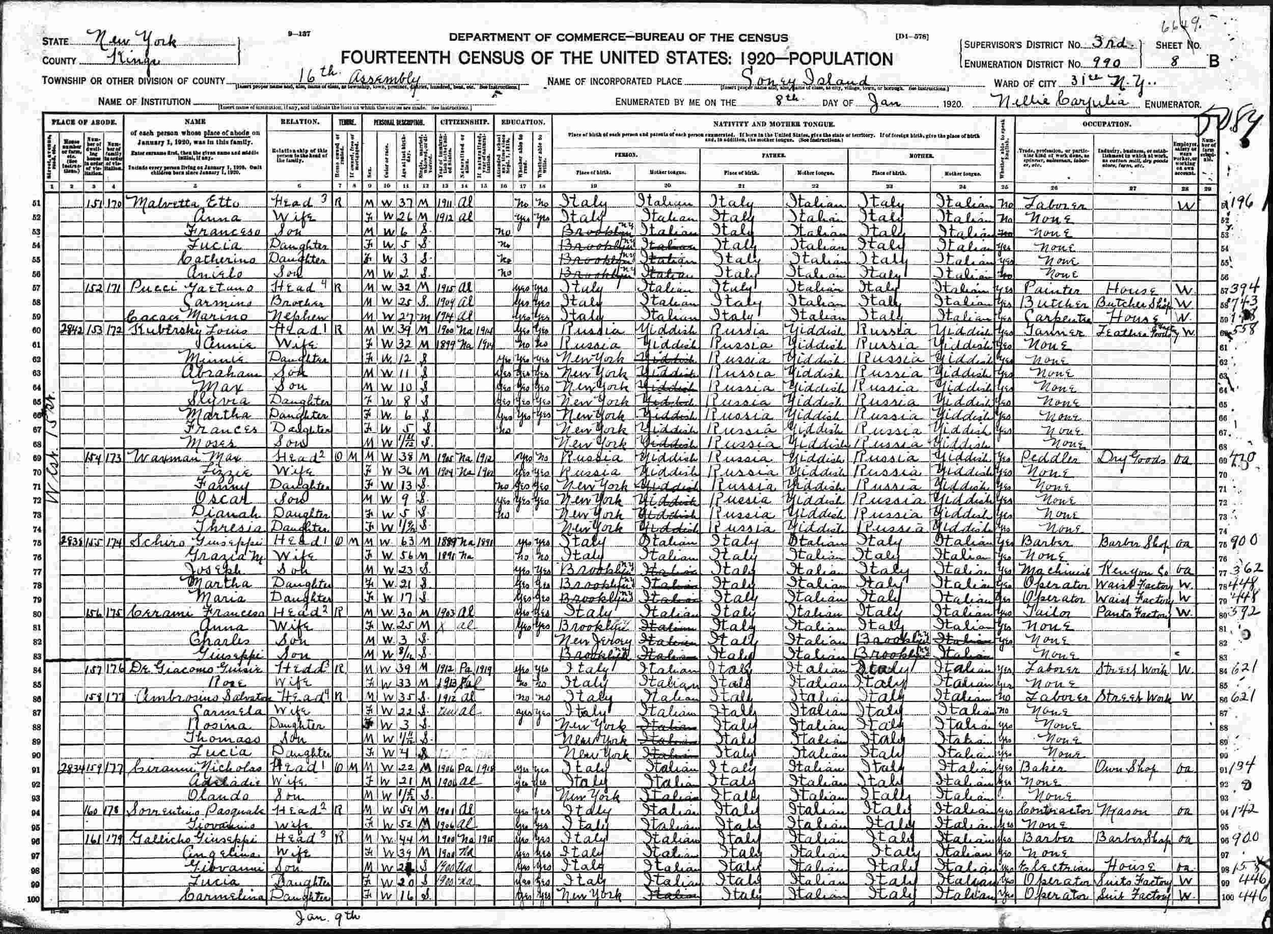 January 8, 1920 - 2842 West 15th Street, Assembly District 16, Ward 31, Supervisor's District 3, Enumeration District 990, Coney Island, Kings County, New York.