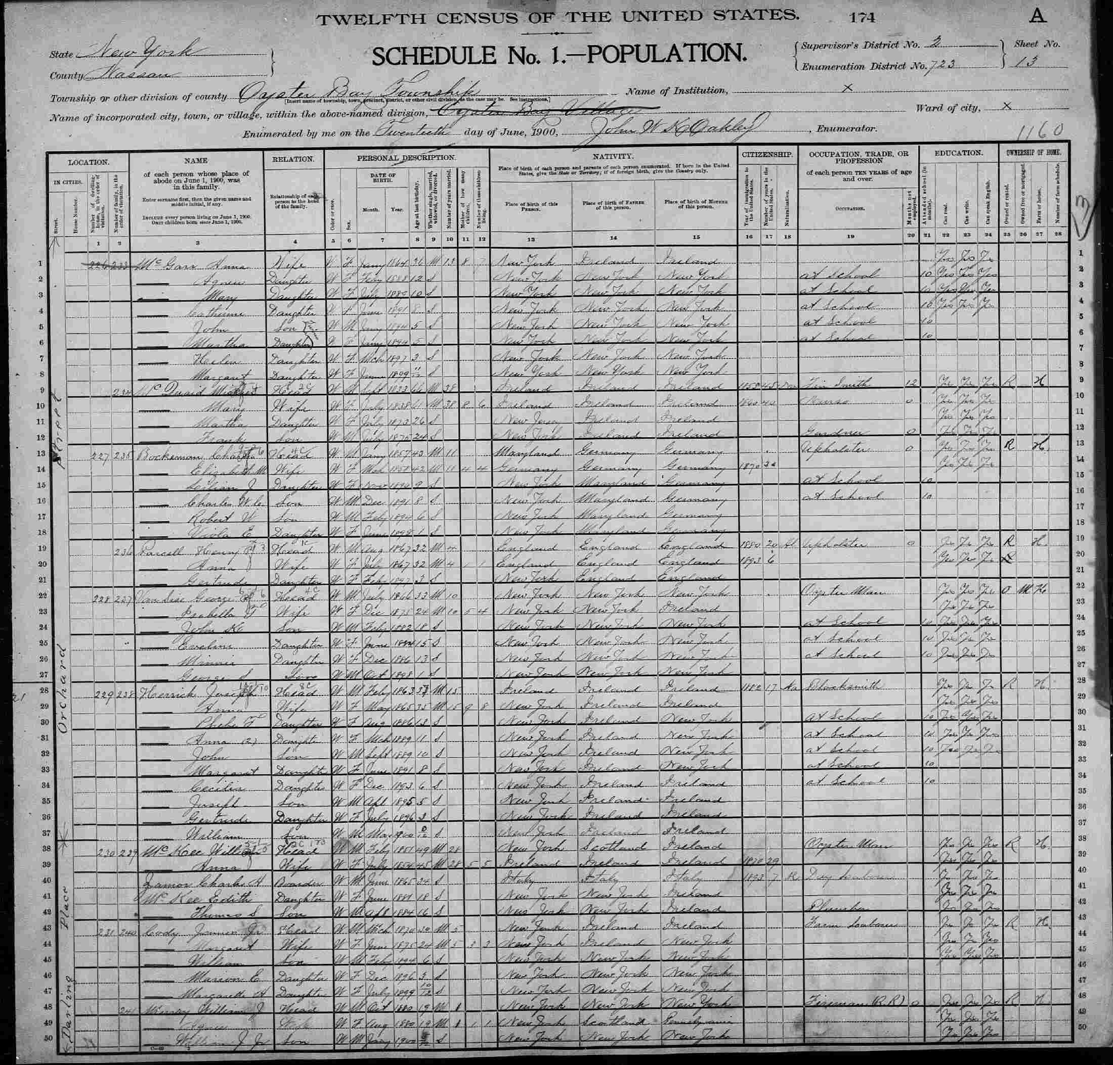 Census: 1870 - Oyster Bay, Nassau County, Long Island, New York.