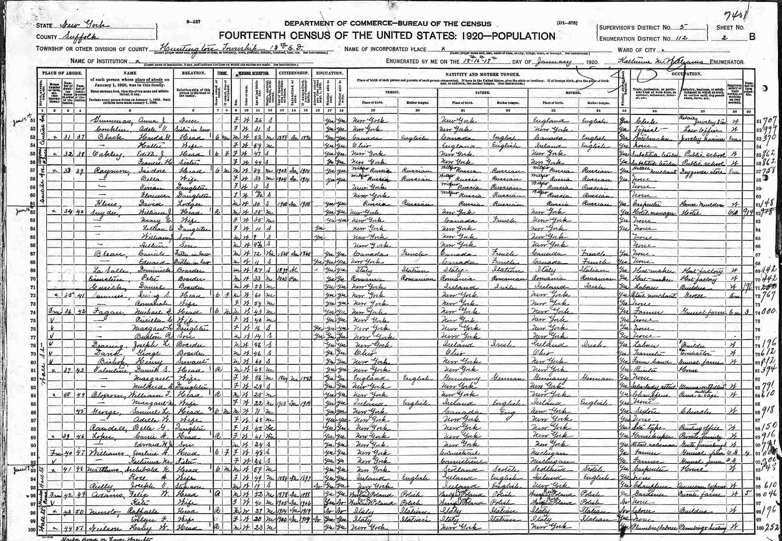 January 15-17, 1920 - Wall Street, Election District 13, Supervisor's District 5, Enumeration District 112, Huntington Township, Suffolk County, New York.