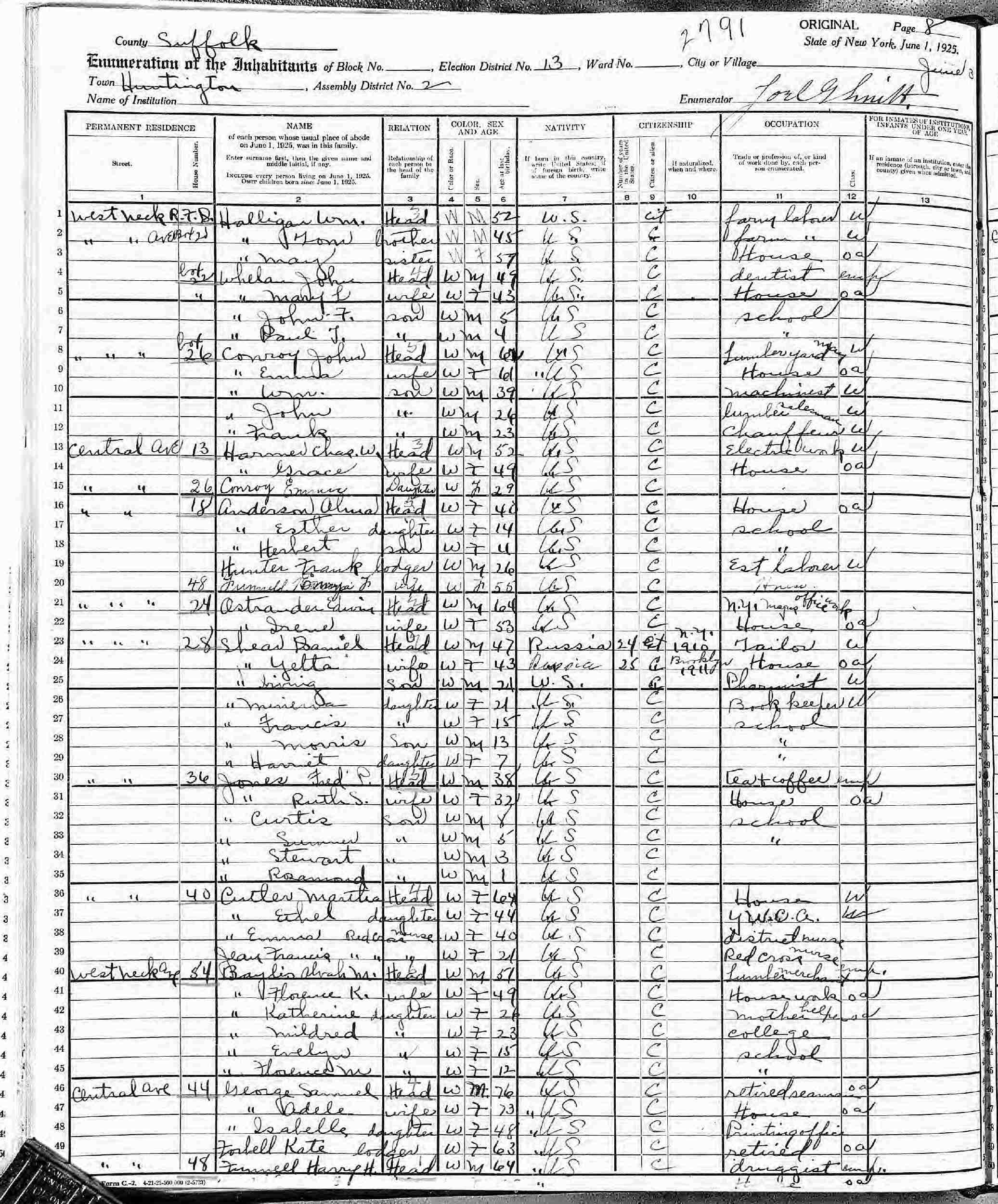 June 3, 1925 - New York State - 44 Central Avenue, Assembly District 2, Election District 13, Huntington, Suffolk County, New York.