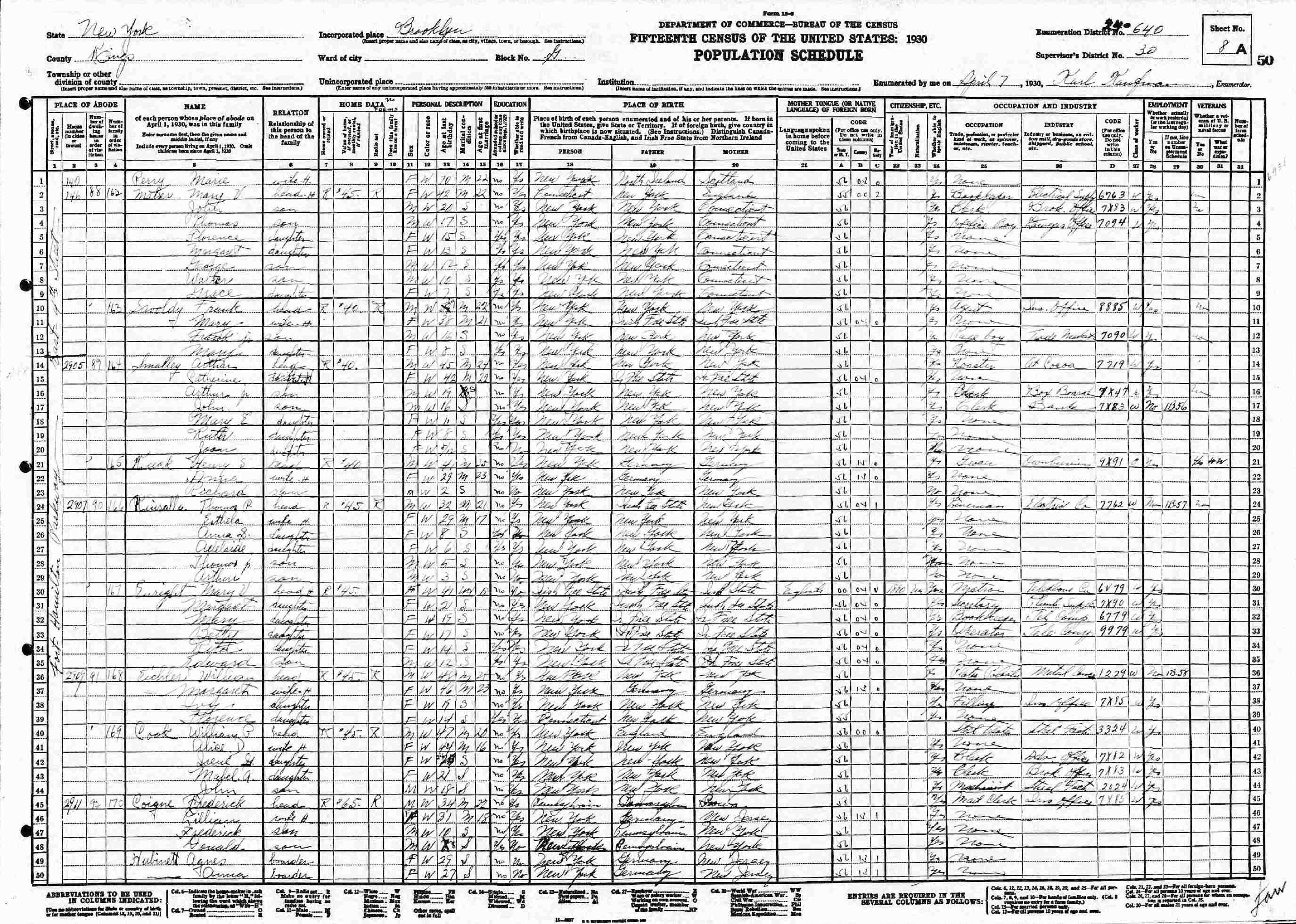 April 7, 1930 - 2907 Fort Hamilton Parkway, Block G, Supervisor's District 30, Enumeration District 24-640, Brooklyn, Kings County, New York.