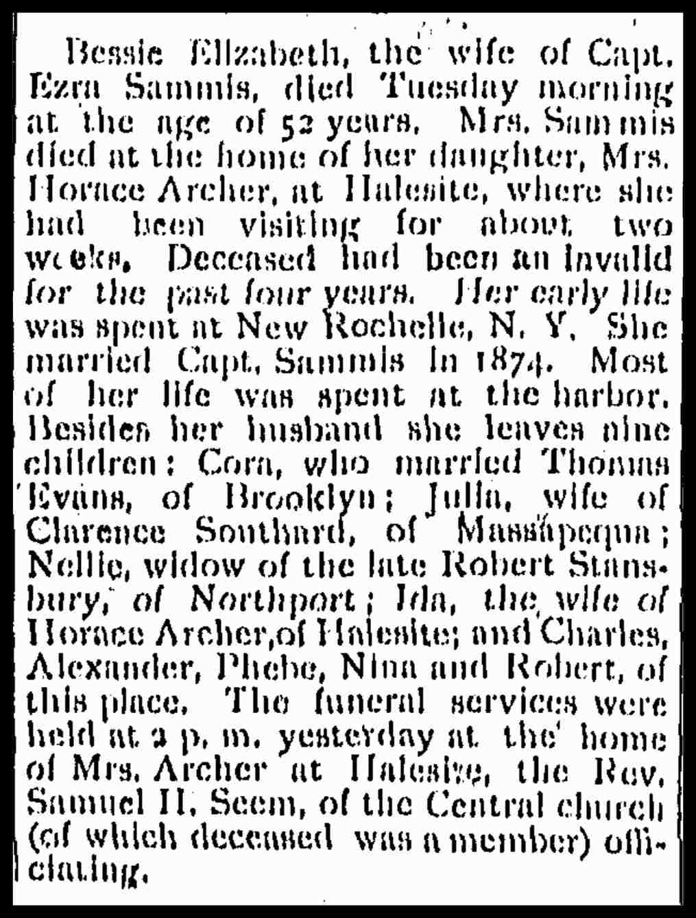 Notes for AUGUSTA "BESSIE" ELIZABETH M SHEFFIELD SAMMIS: