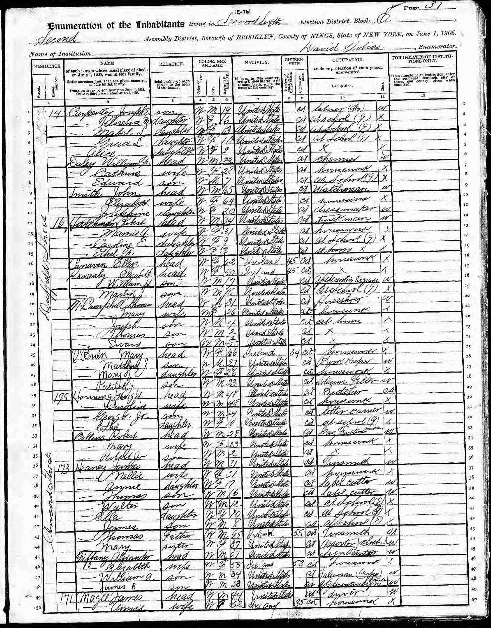 June 1, 1905 - New York State - 16 Duffield Street, Assembly District 2, Election District 6, Block E, Brooklyn, Kings County, New York.