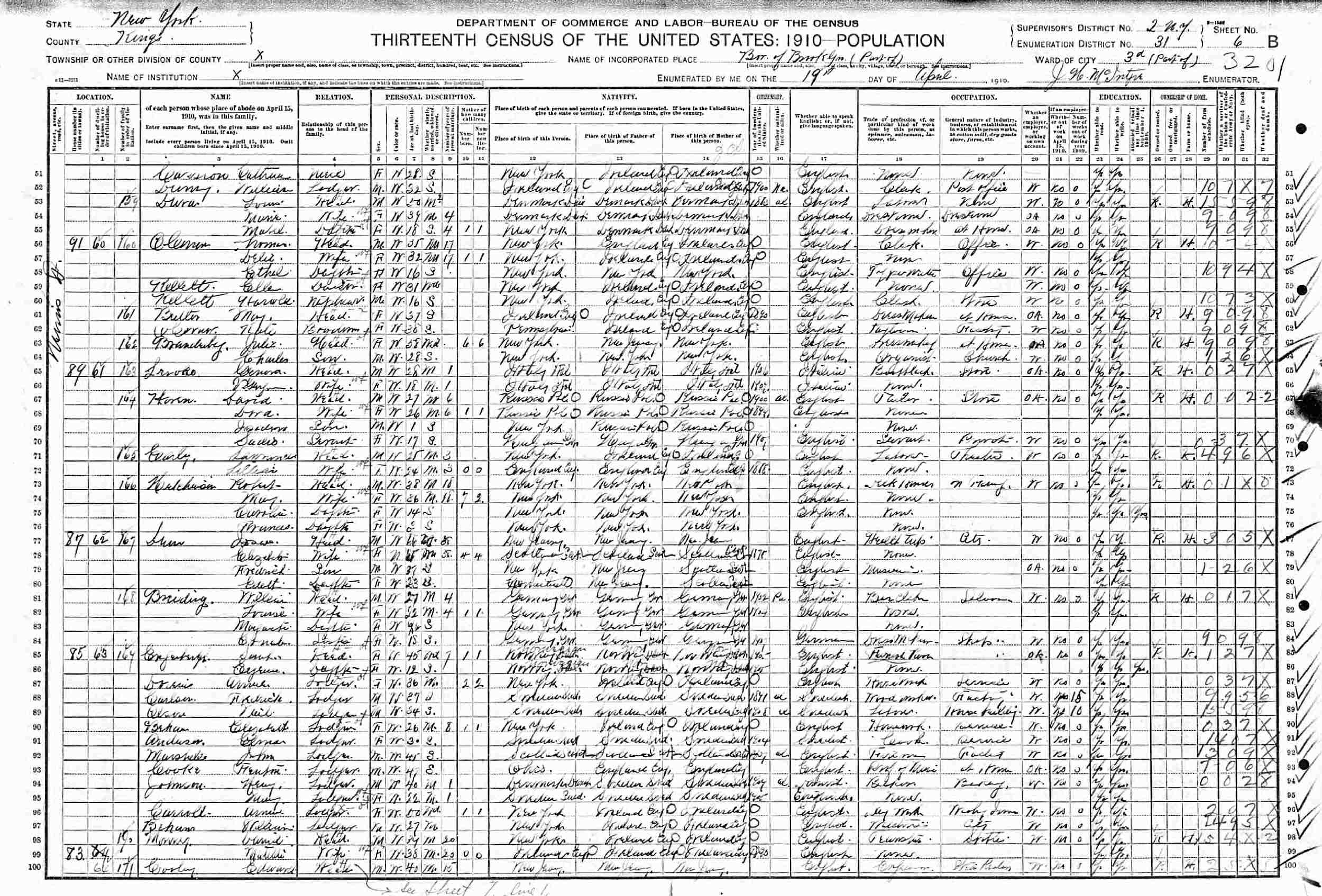 April 19, 1910 - 89 Morris Street, Ward 3, Supervisor's District 2, Enumeration District 31, Brooklyn, Kings County, New York.