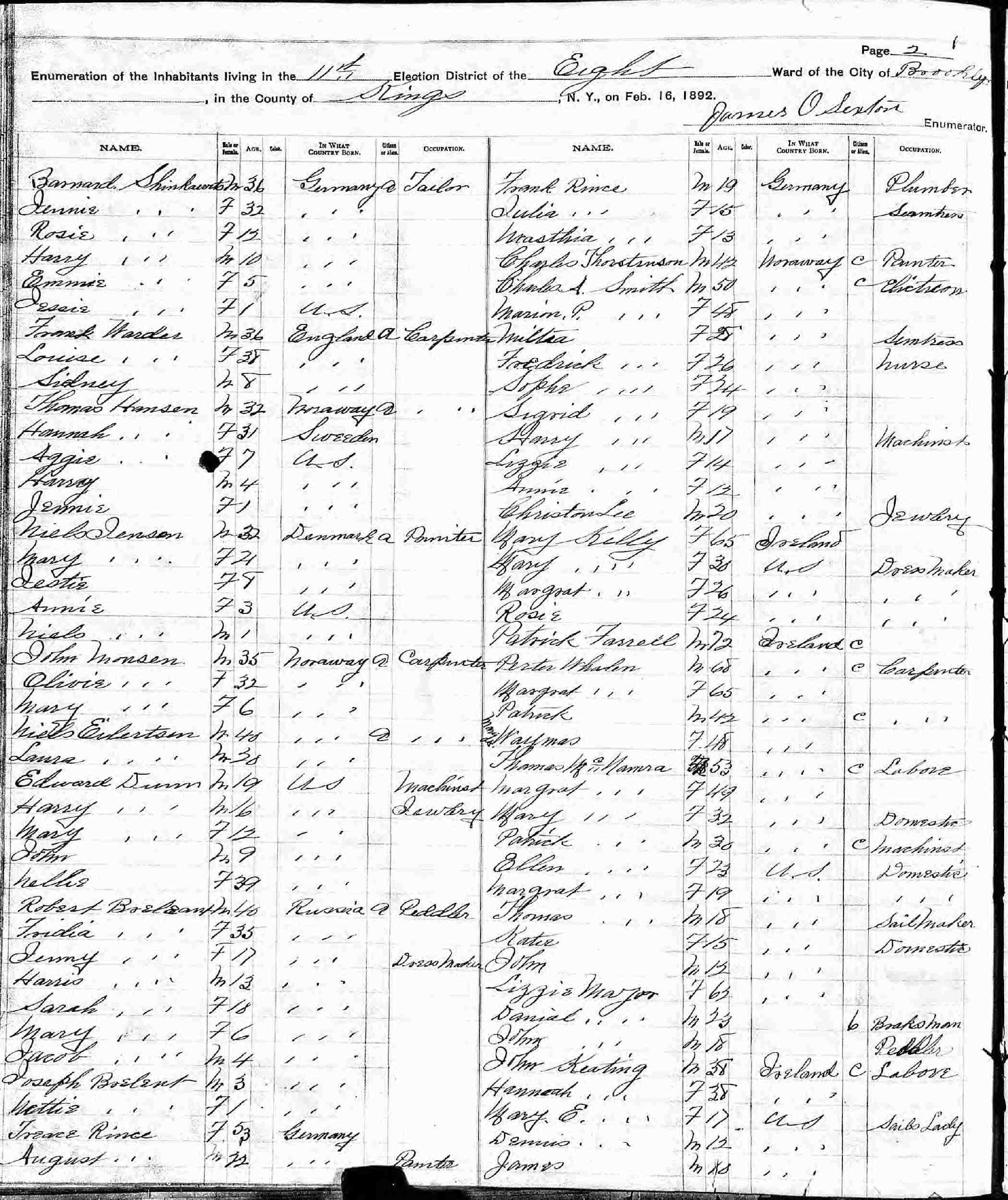 February 16, 1892 - New York State - Election District 11, Ward 8, Brooklyn, Kings County, New York.