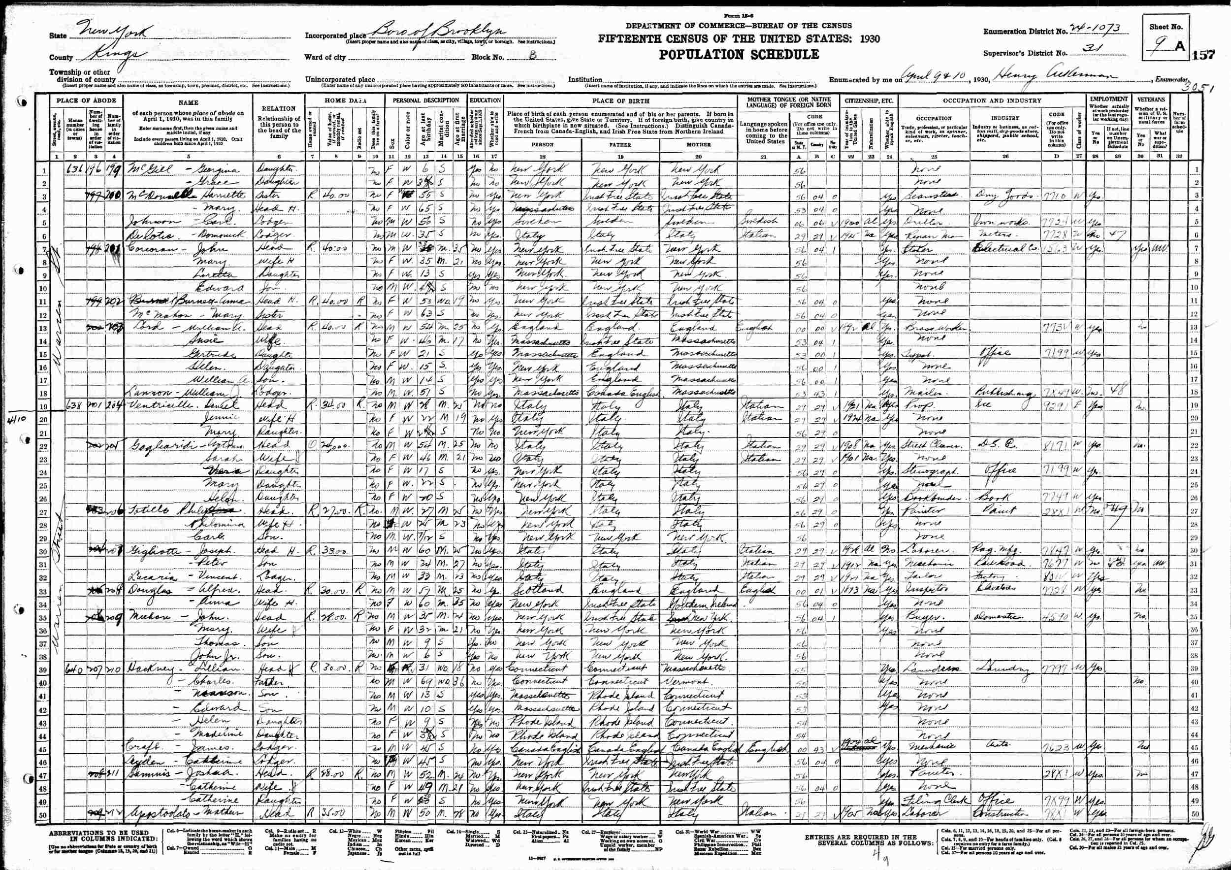 April 9-10, 1930 - 640 Warrent Street, Block B, Supervisor's District 31, Enumeration District 24-1073, Brooklyn, Kings County, New York.