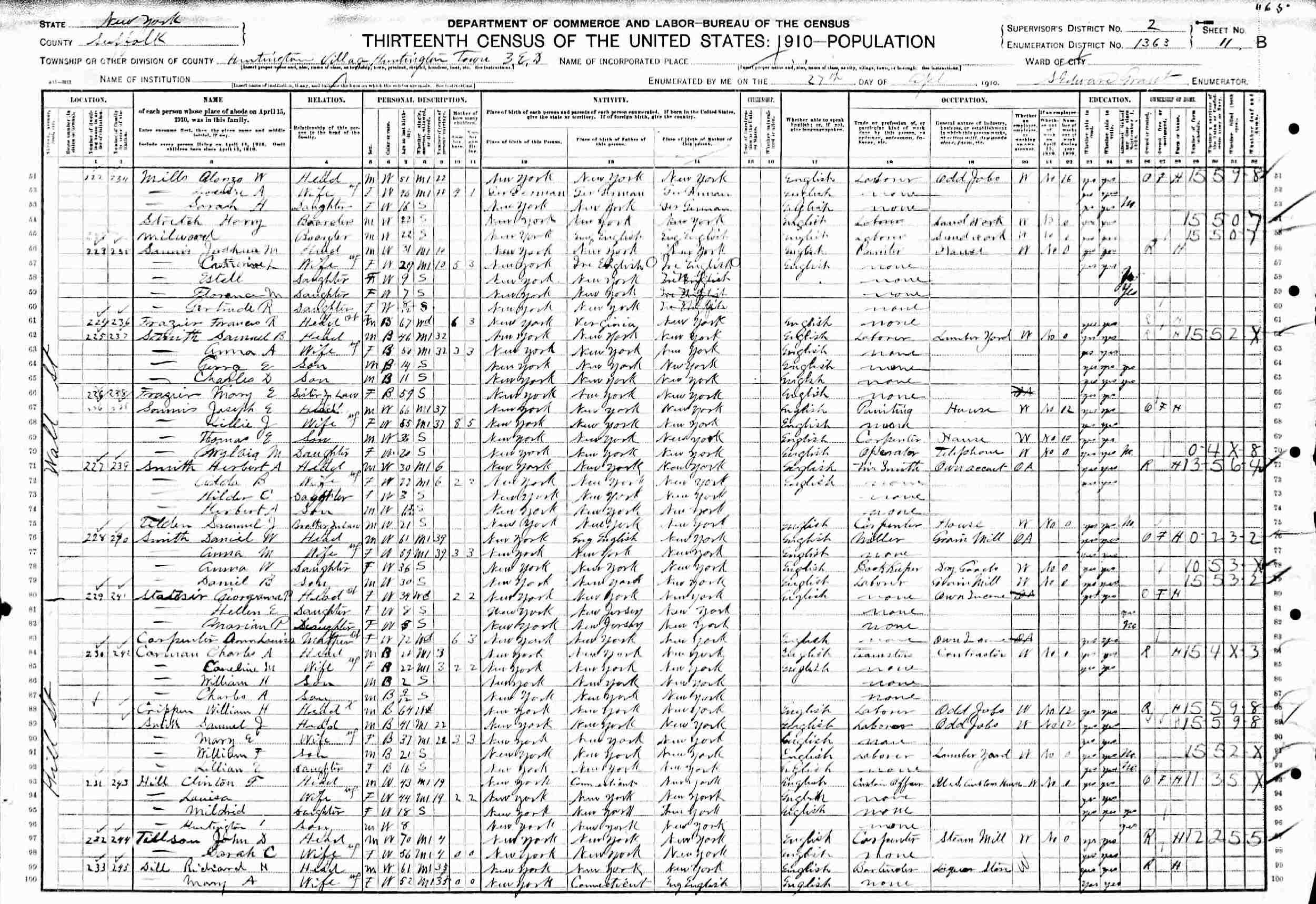April 27, 1910 - Wall Street, Huntington Village, Huntington Town, Election District 3, Supervisor's District 2, Enumeration District 1363, Suffolk County, New York.