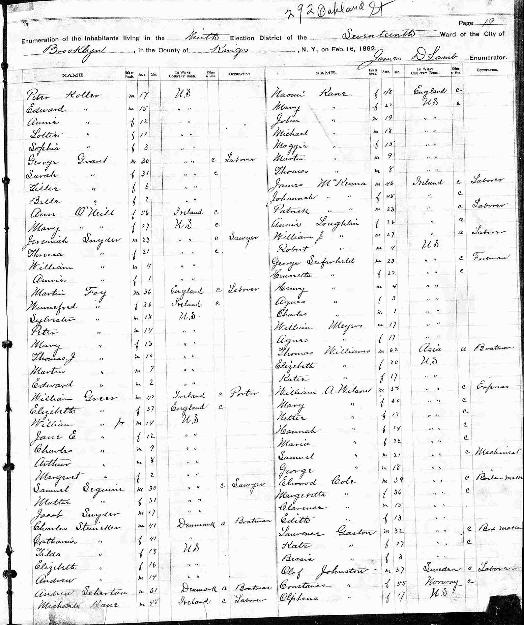 February 16, 1892 - 292 Oakland Street, Ward 17, Election District 9, Brooklyn, Kings County, New York.