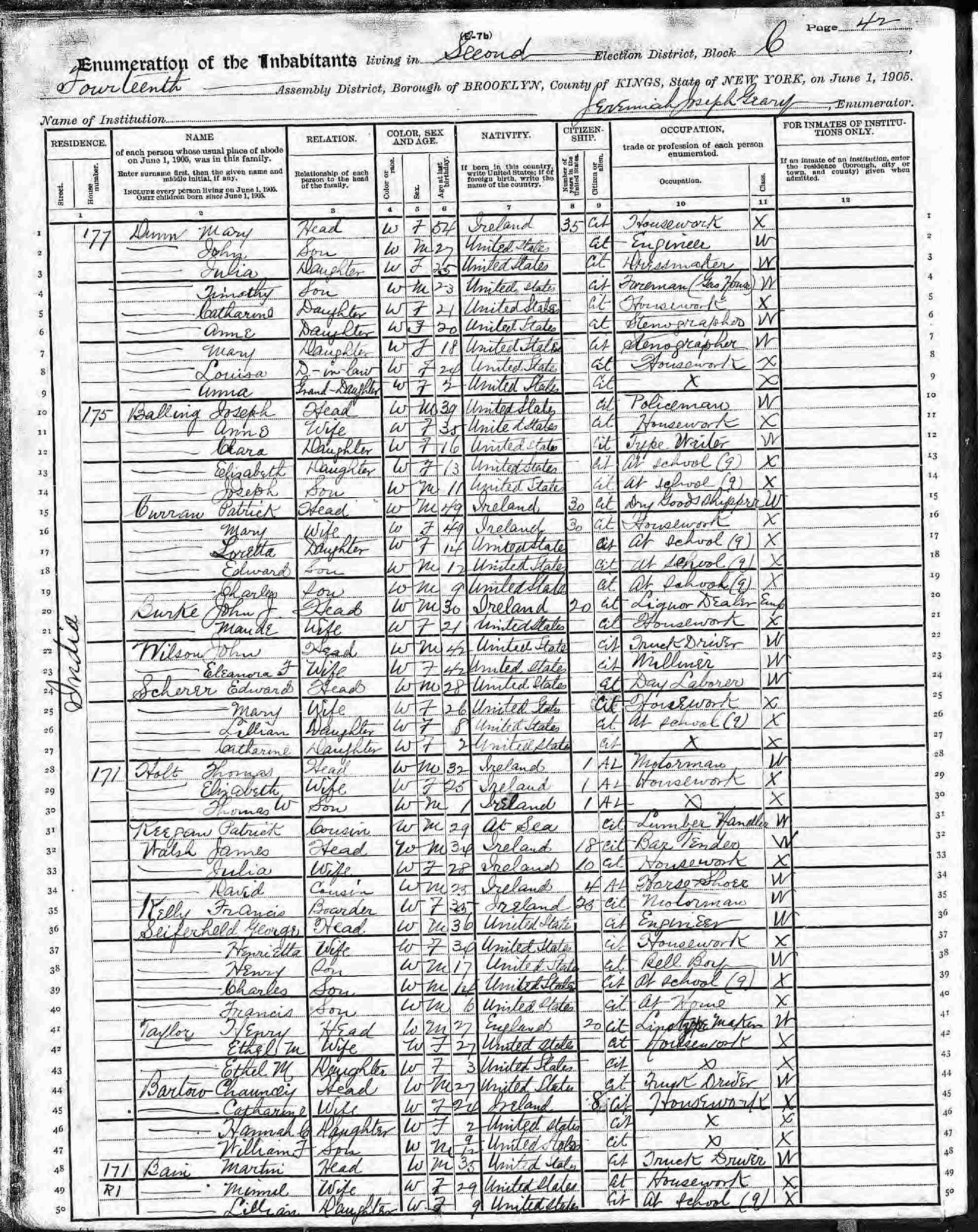 June 1, 1905 - New York State - 171 India, Assembly District 14, Election District 2, Block 6, Brooklyn, Kings County, New York.