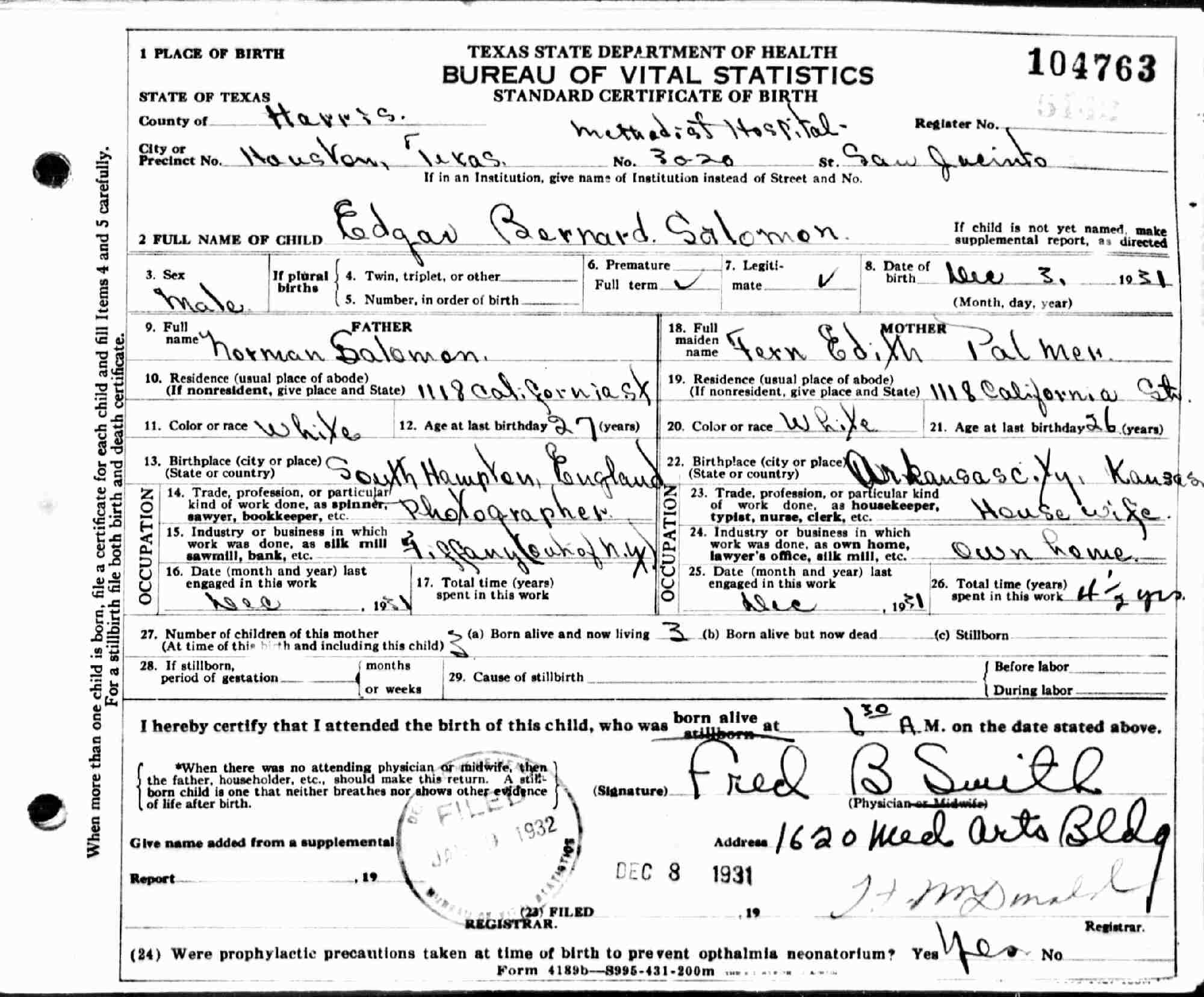 Born: December 3, 1931 Houston, Harris County, Texas.