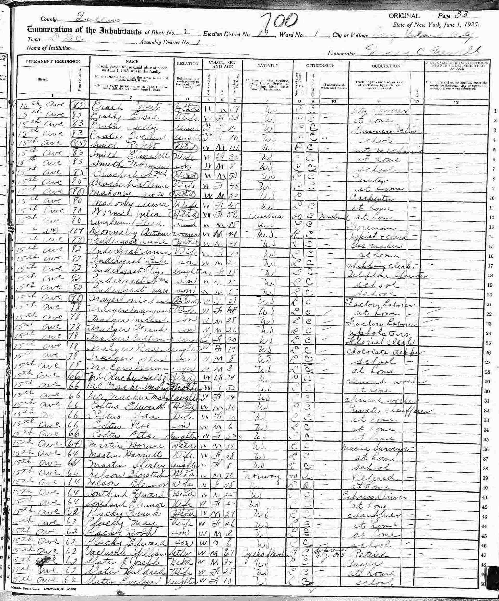 June 1, 1925 - New York State - 64 15th Avenue, Block 2, Election District 19, Assembly District 1, Long Island City, Queens County, New York.
