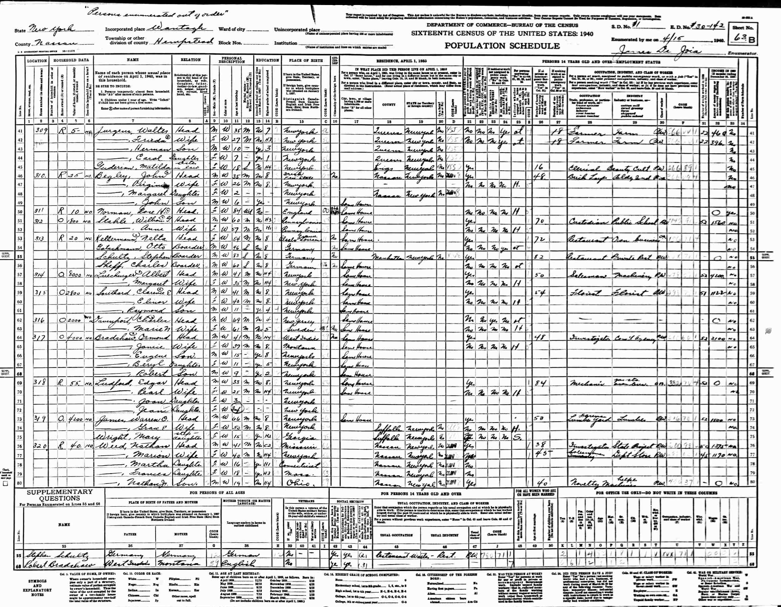 April 15, 1940 - Supervisor's District 1, Enumeration District 30-142, Wantagh, Hempstead, Nassau County, New York.