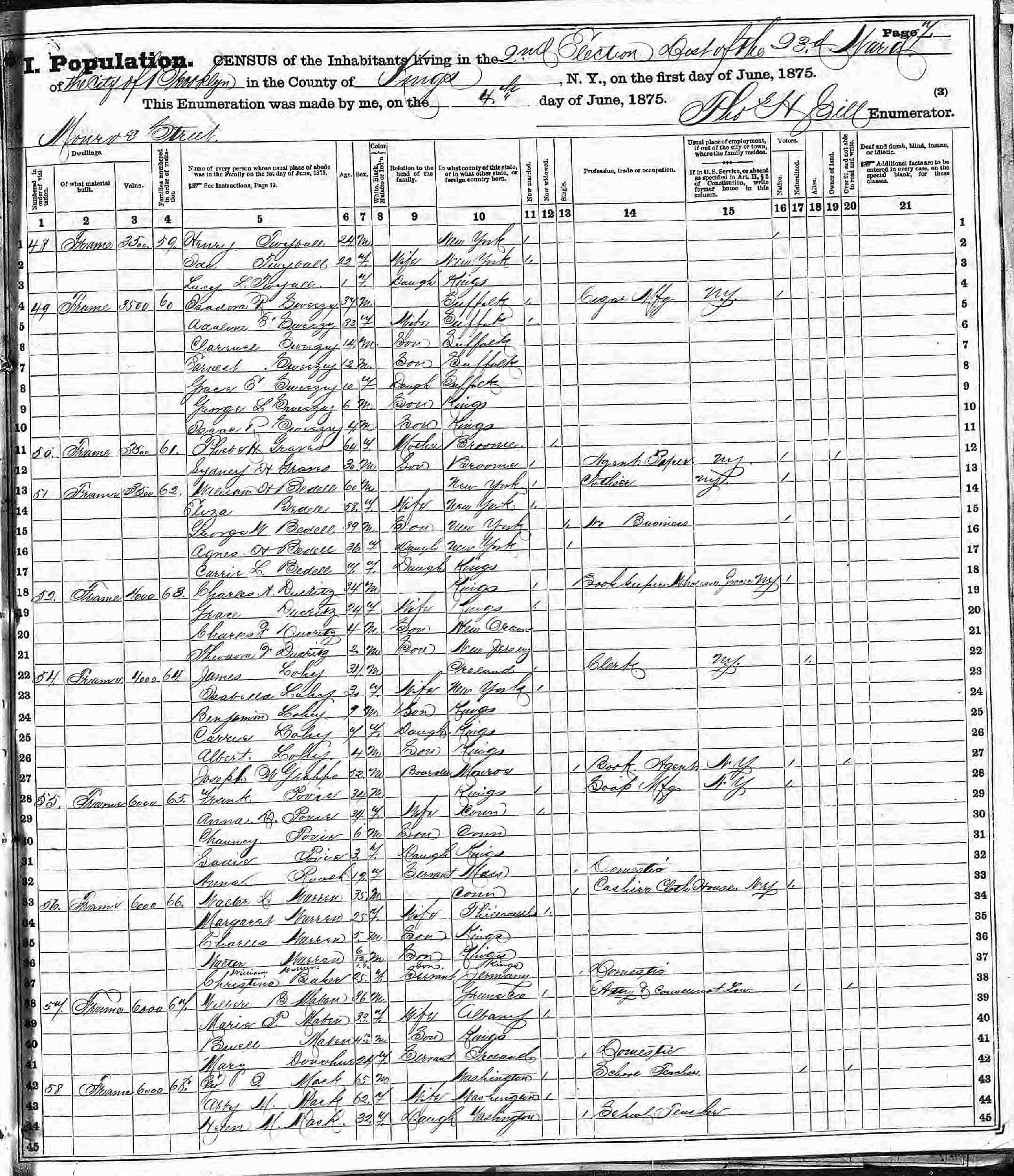 June 1, 1875 - New York State - Ward 23, Election District 2, Brooklyn, Kings County, New York.