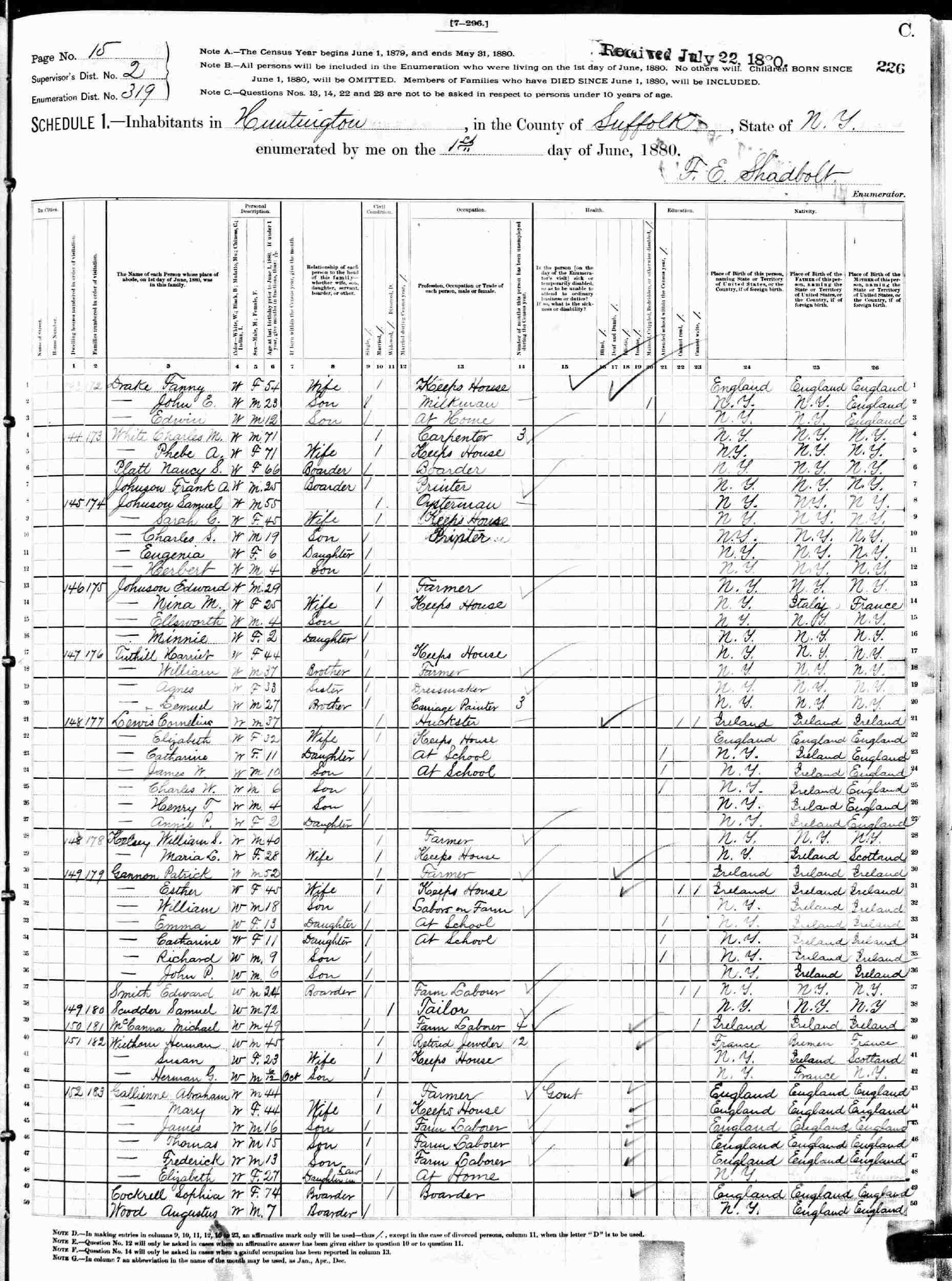 June 1, 1880 - Supervisor's District 2, Enumeration District 319, Huntington, Suffolk County, New York.
