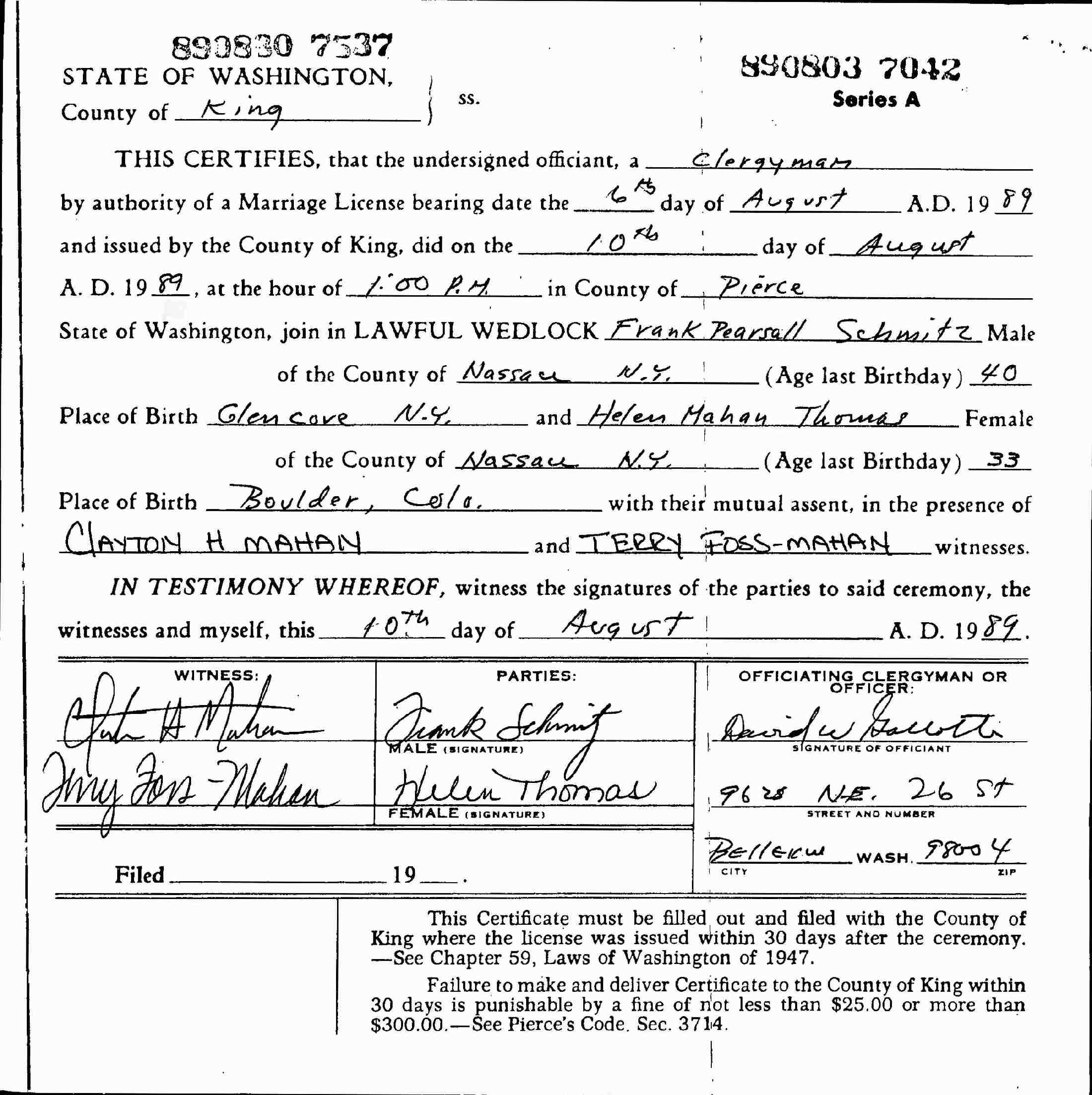 (2) Frank Pearsall Schmitz August 10, 1989 in Pierce County, Washington. (Marriage License: August 6, 1989 - King County, Washington.)