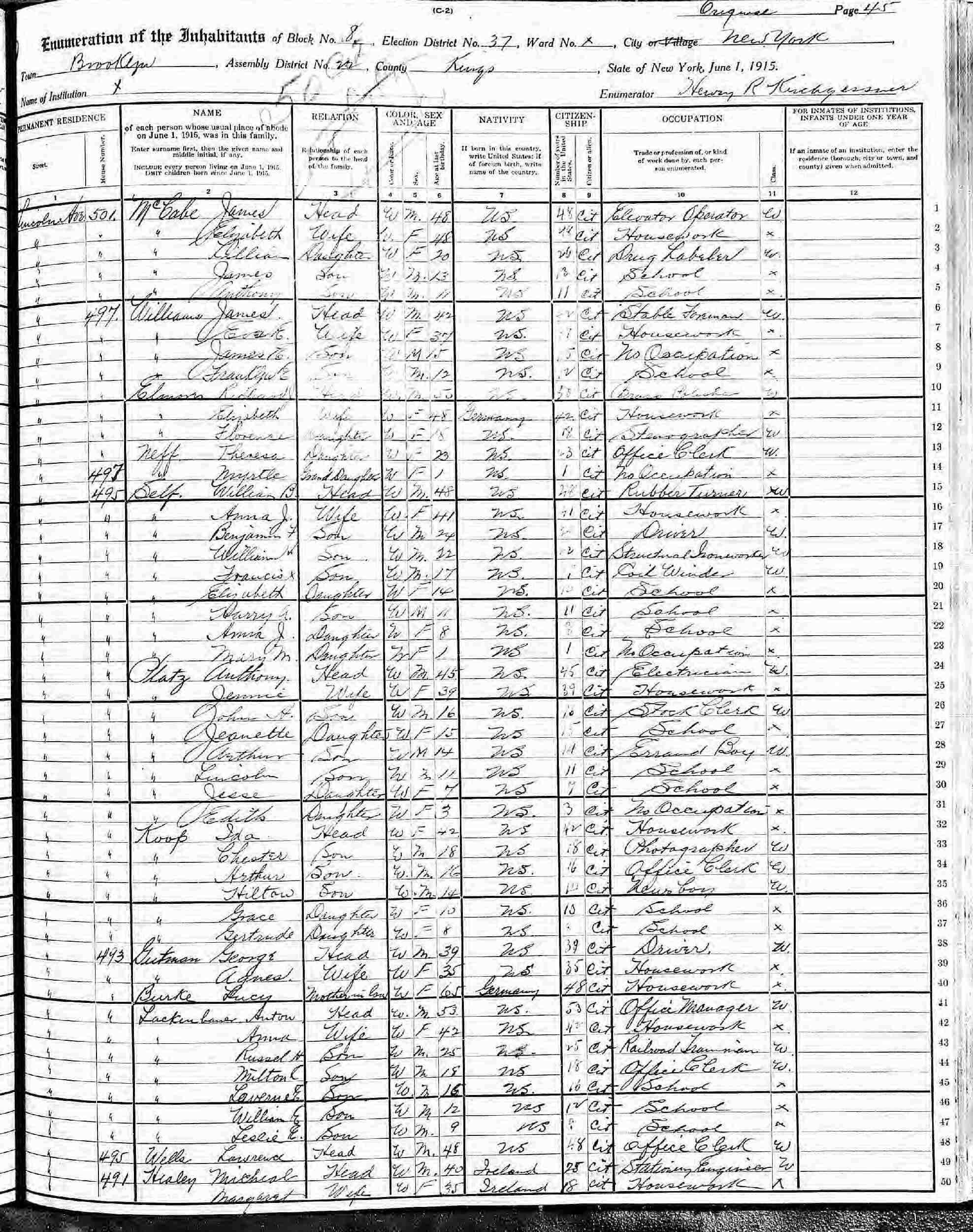 June 1, 1915 - New York State - 495 Lincoln Avenue, Assembly District 22, Election District 37, Block 8, Brooklyn, Kings County, New York.