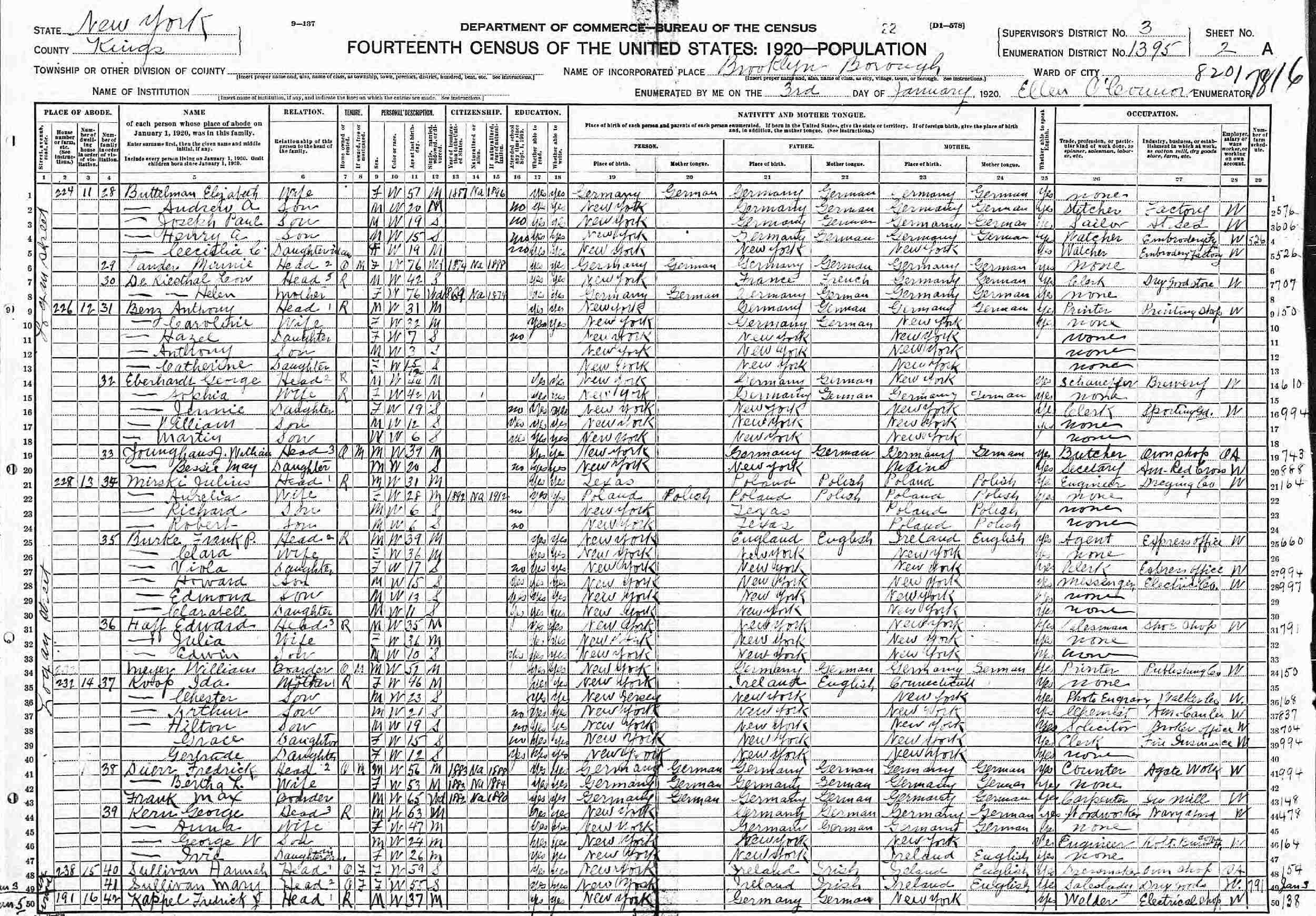 January 3, 1920 - 232 Logan Street, Supervisor's District 3, Enumeration District 1395, Brooklyn, Kings County, New York.