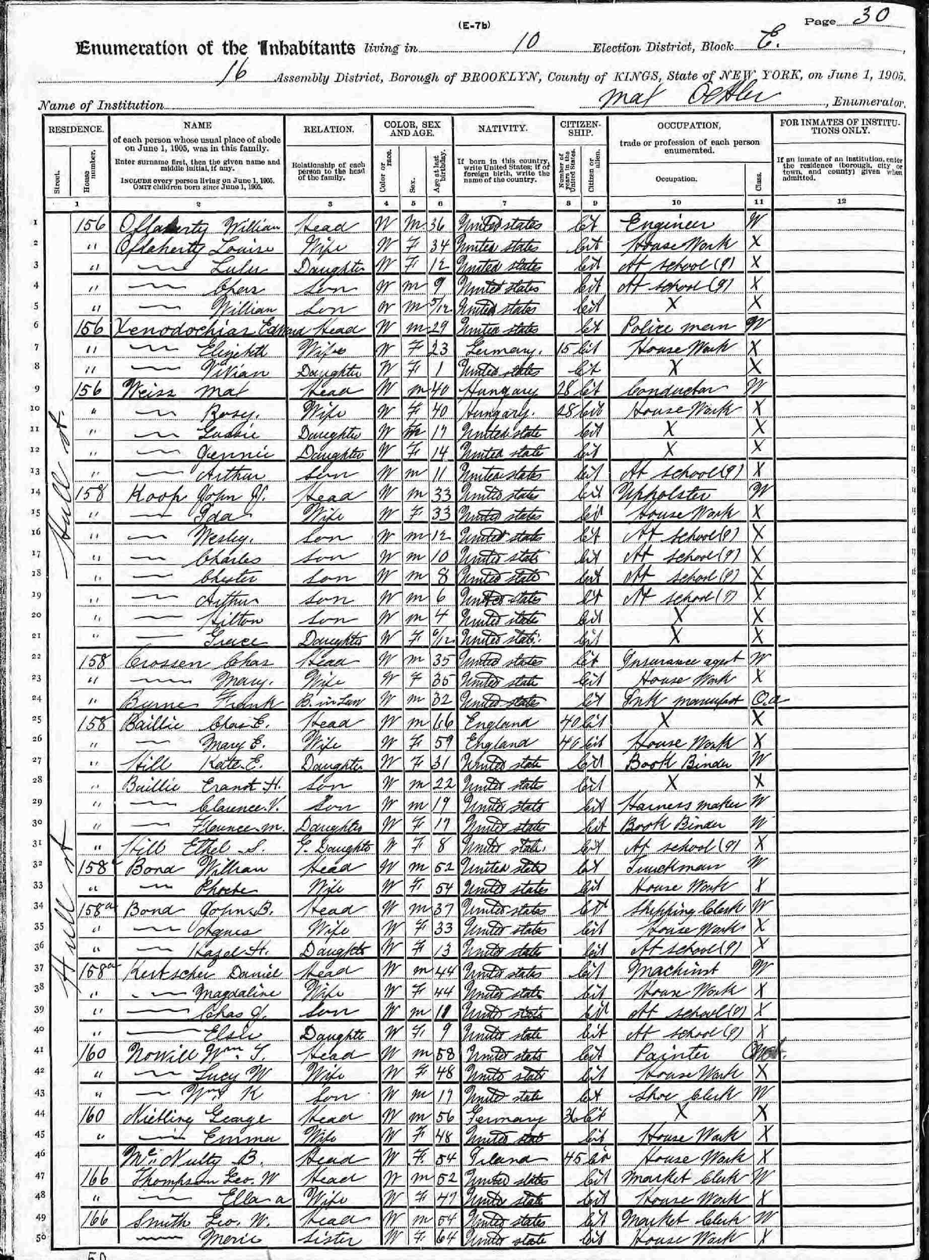 June 1, 1905 - New York State - 158 Hull Street, Assembly District 16, Election District 10, Block E, Brooklyn, Kings County, New York .