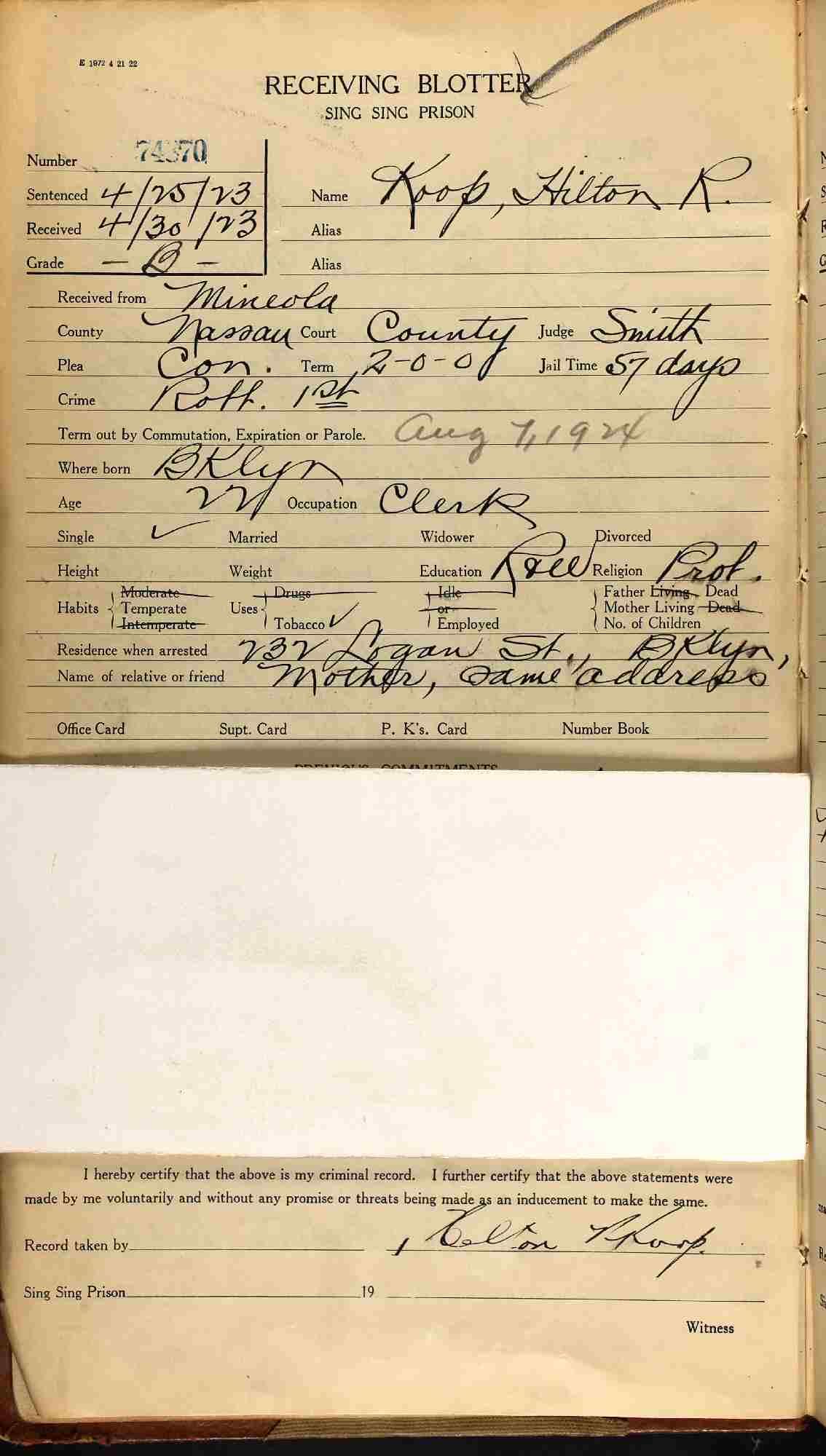 April 30, 1924-August 7, 1924 - Incarcerated Sing Sing Prison - Robbery 1st Degree.