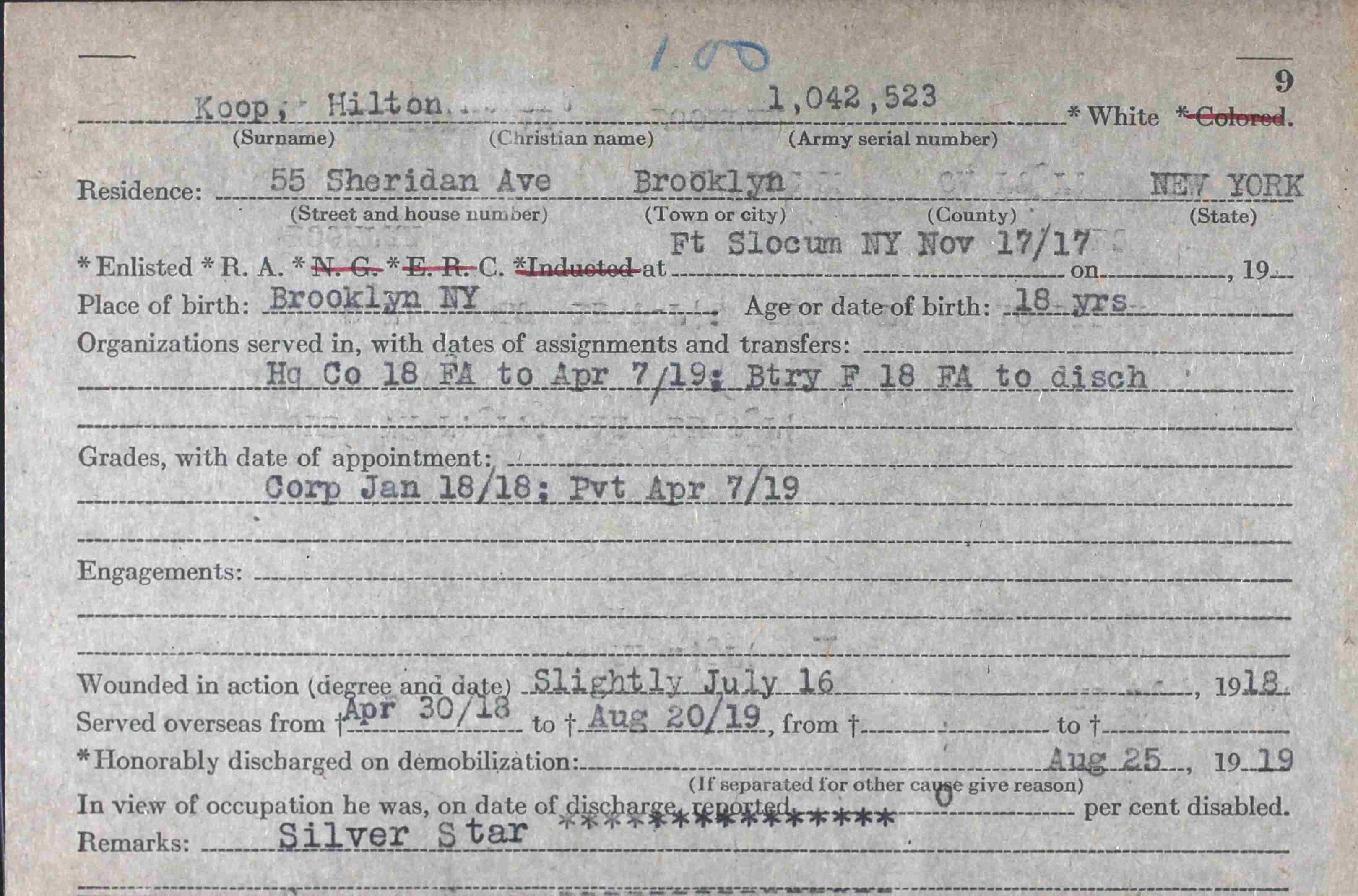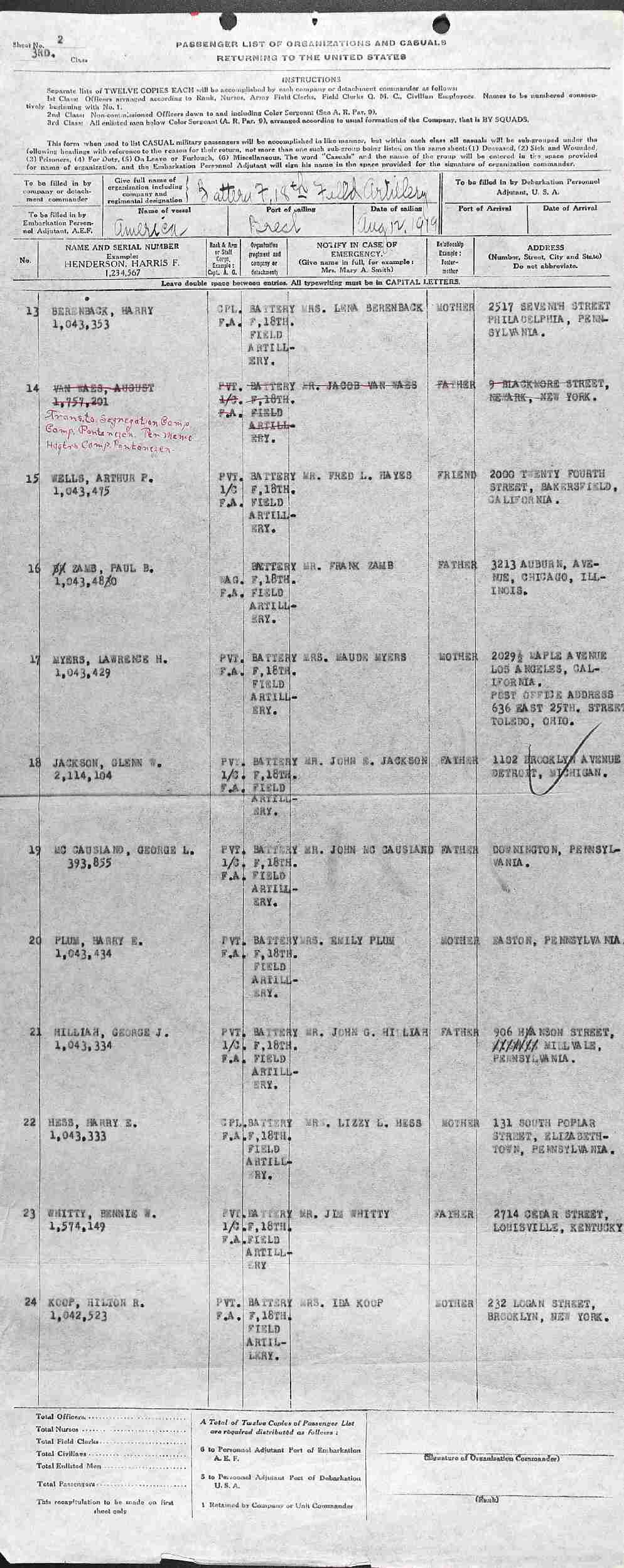 November 17, 1917-August 12, 1919 - WWI - Hc Co 19 FA; Battery F, PVT PA, Battery F, 18th Field Artillery.