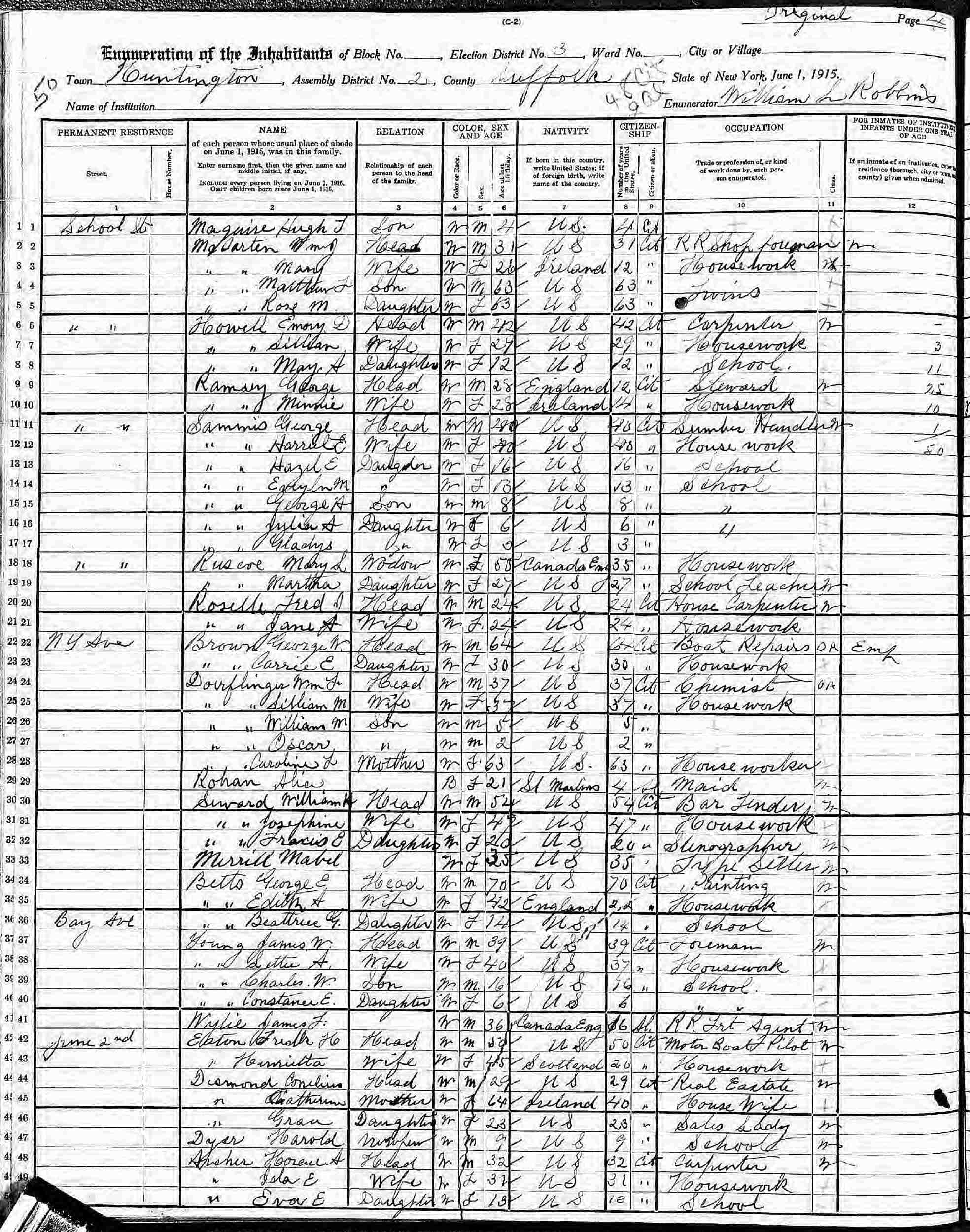 June 1-2, 1915 - New York State - Bay Avenue, Assembly District 2, Election District 3, Huntington, Suffolk County, New York.