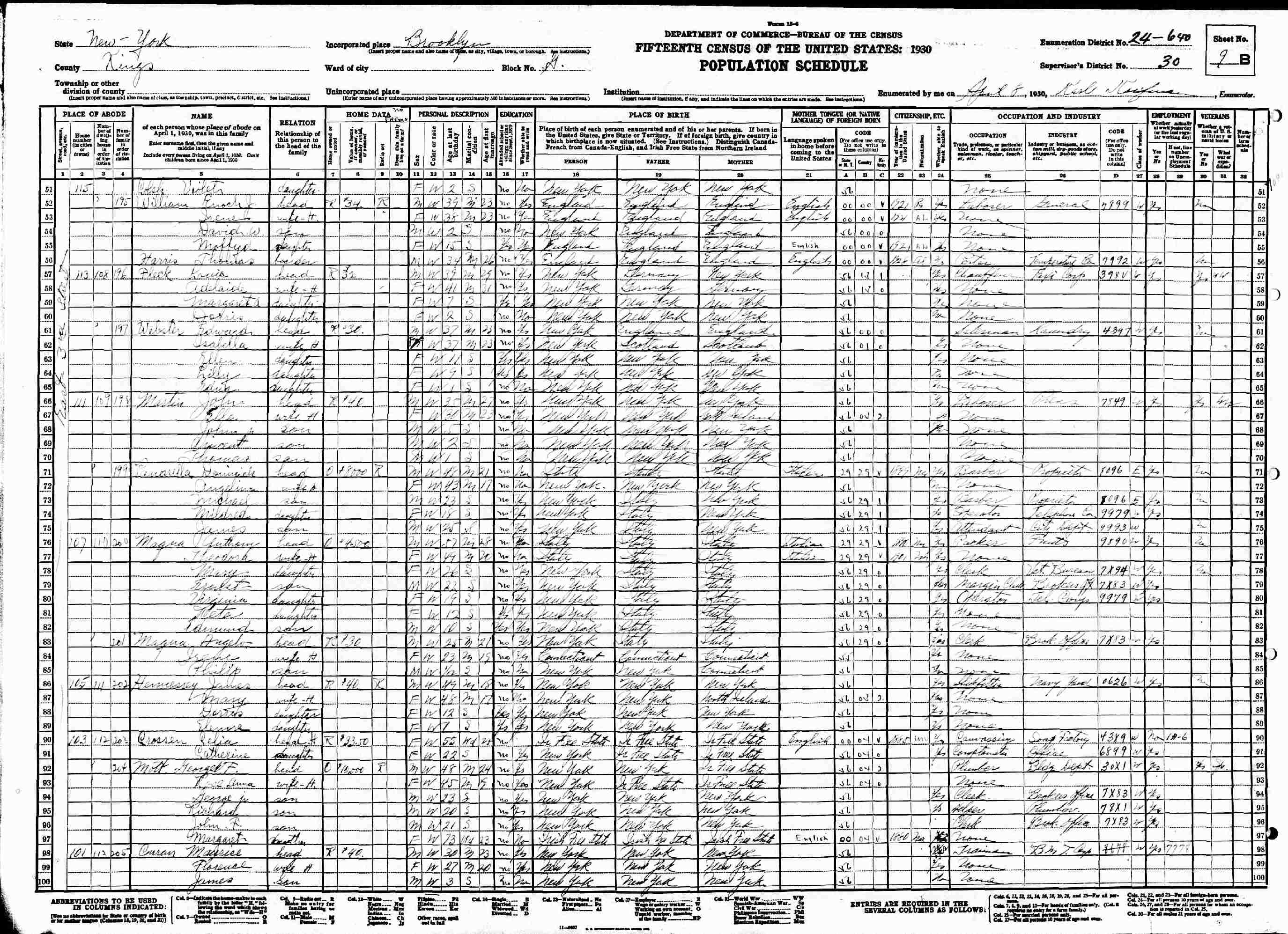 April 8, 1930 - 101 East 3rd Street, Block G, Supervisor's District 30, Enumeration District 24-640, Brooklyn, Kings County, New York.