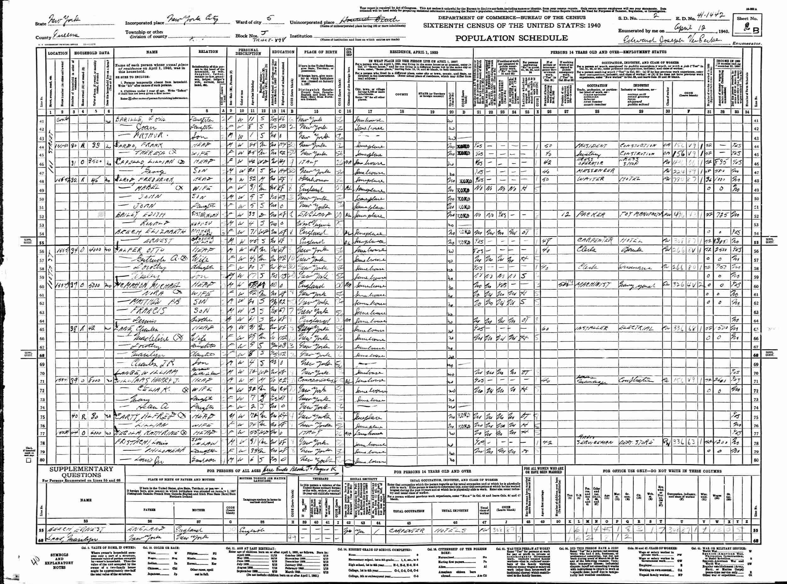April 12, 1940 - 15552 101st Street, Ward 5, Block J, Tract 878, Supervisor's District 2, Enumeration District 44-1442, Howard Beach, New York City, Queens County, New York.