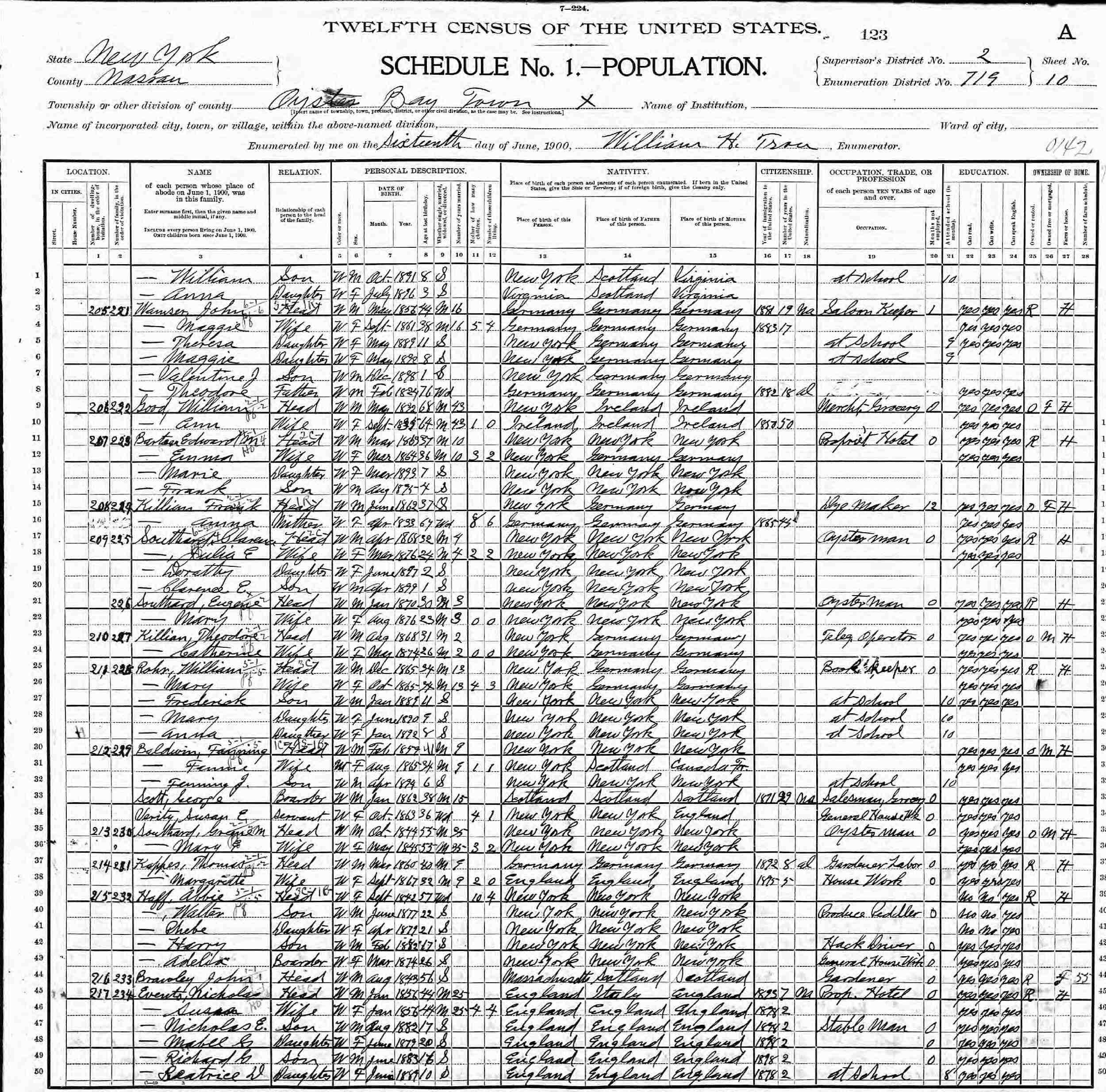 June 16, 1900 - Supervisor's District 2, Enumeration District 719, Oyster Bay, Nassau County, New York.