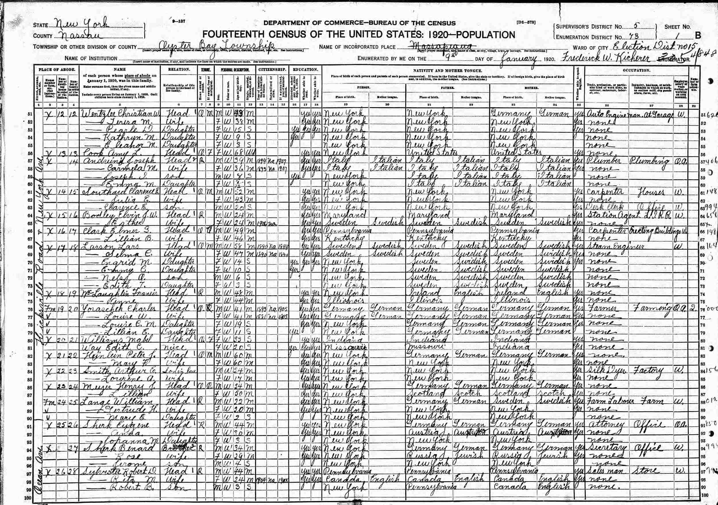 January 9, 1920 - Election District 15, Supervisor's District 5, Enumeration District 73, Oyster Bay, Nassau County, New York.