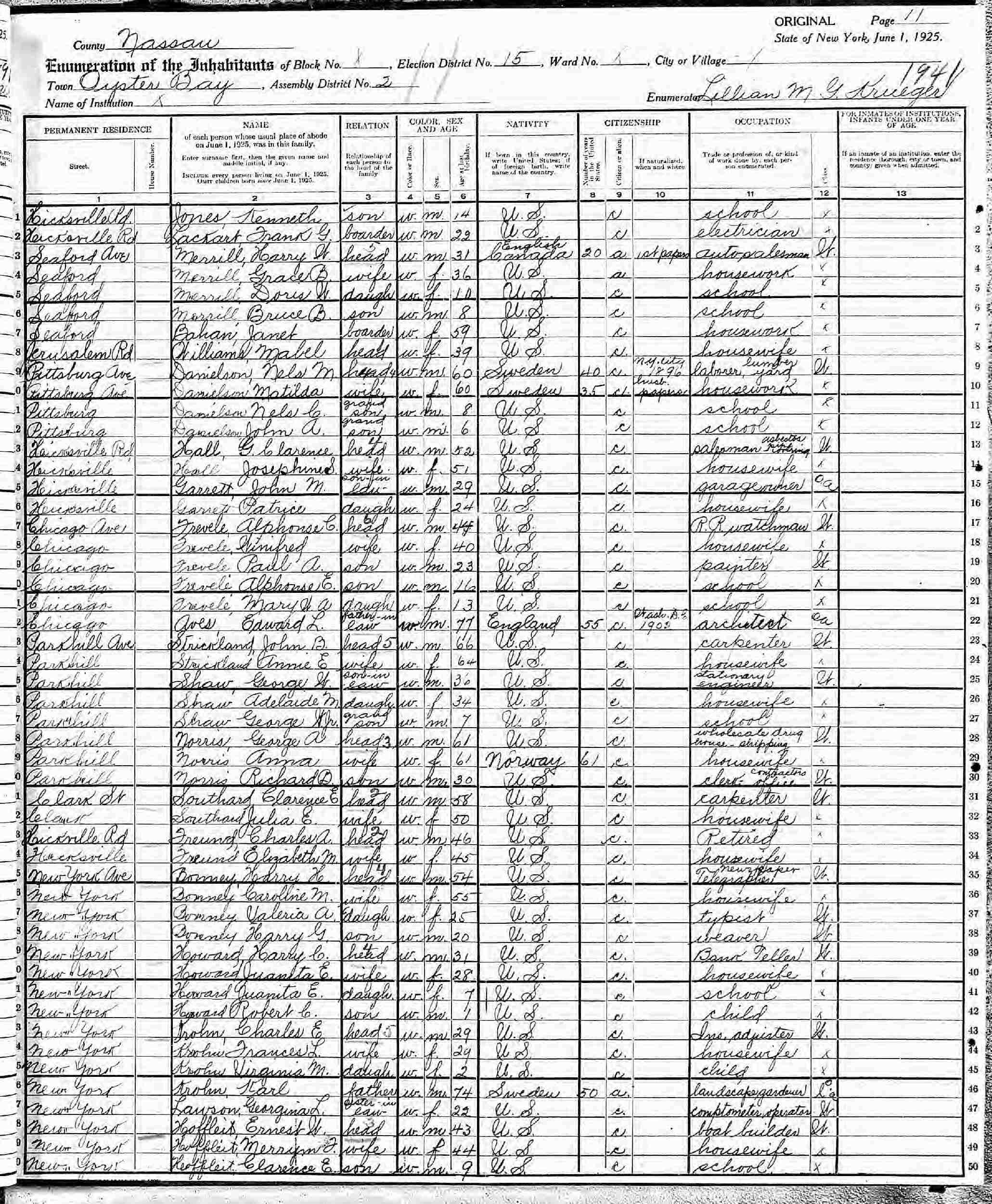 June 1, 1925 - New York State - Clark Street, Election District 15, Assembly District 2, Oyster Bay, Nasau County, New York.