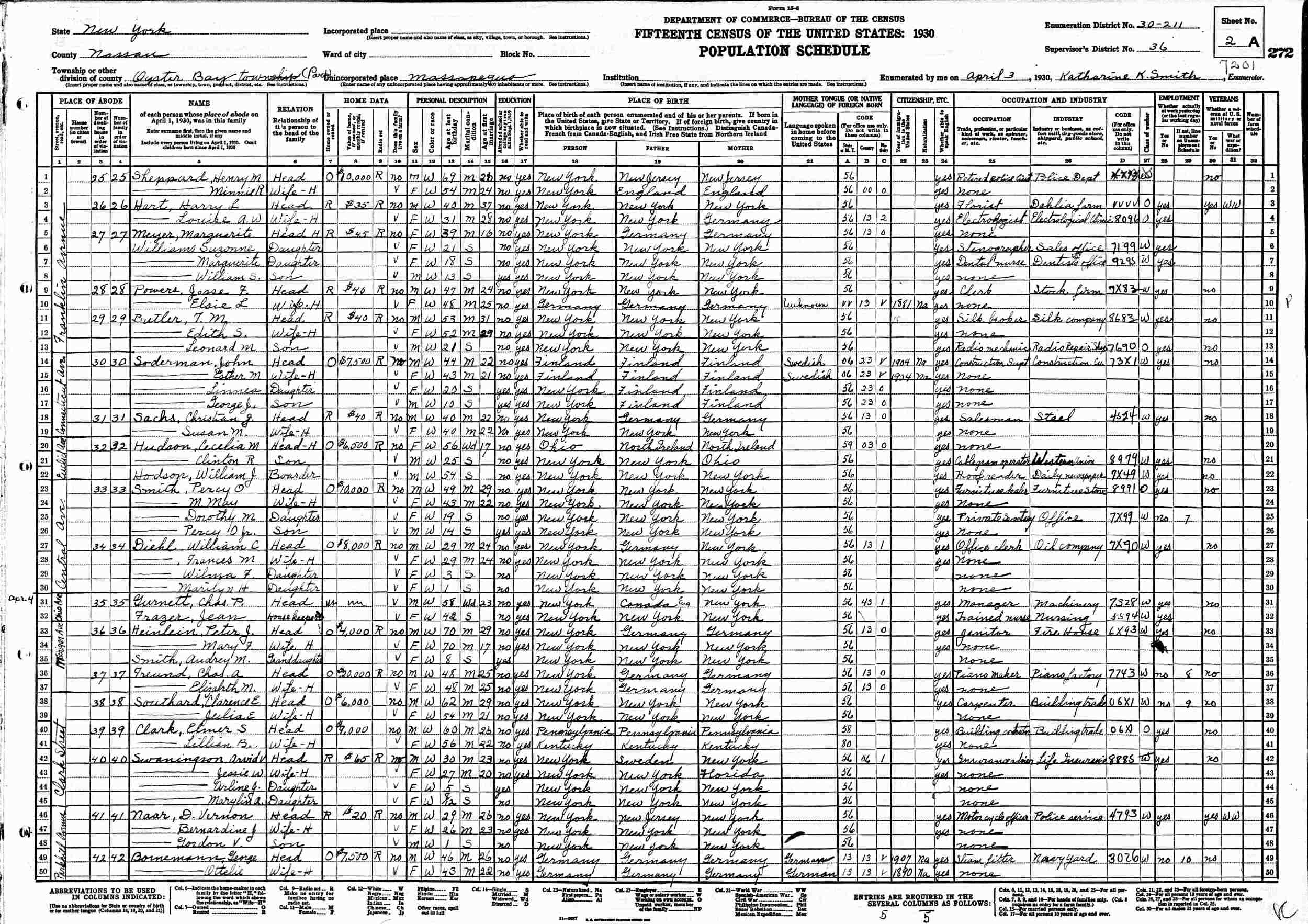 April 3, 1930 - Clark Street, Supervisor's District 36, Enumeration District 30-211, Massapequa, Oyster Bay Town, Nassau County, New York.