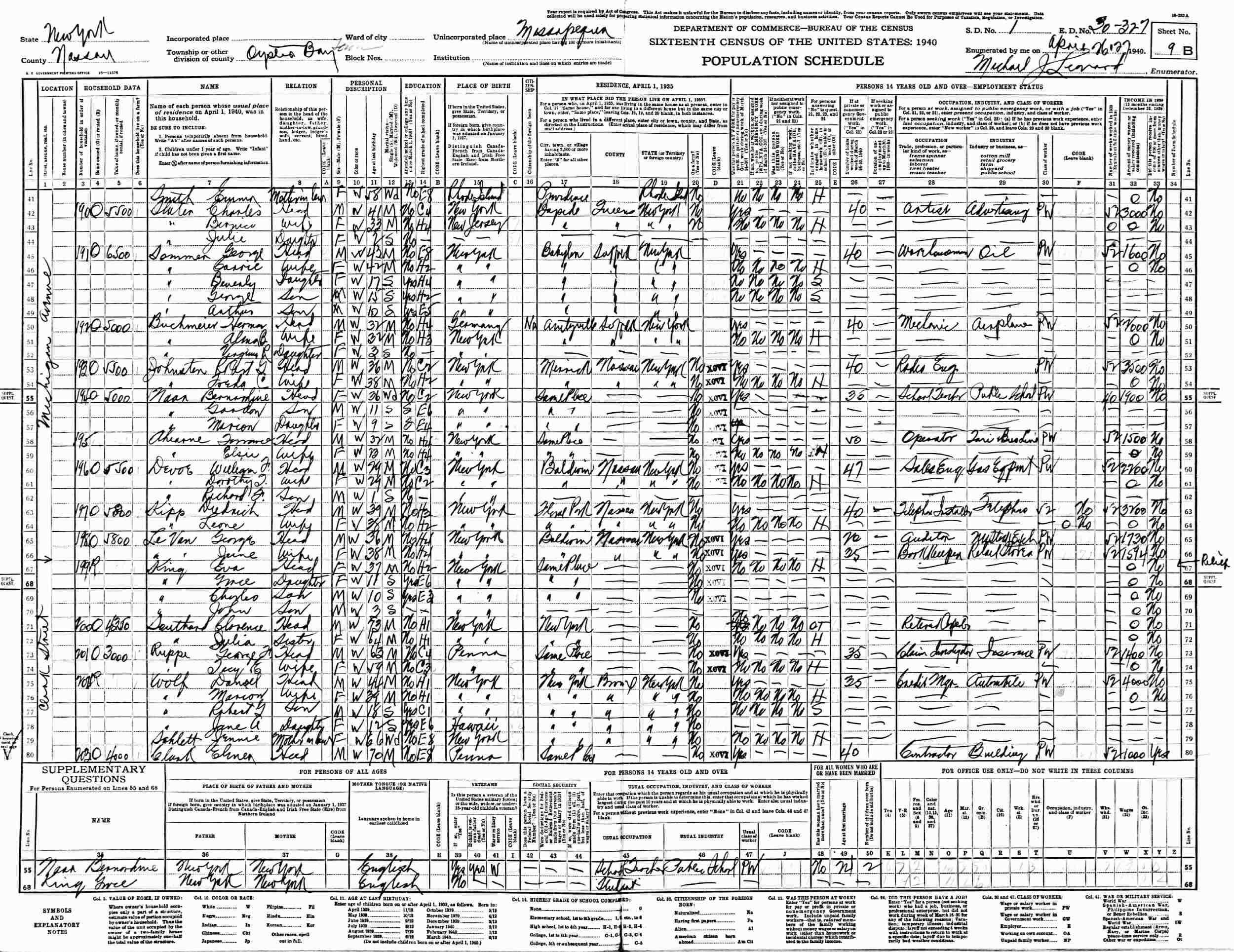April 26-27, 1940 - Clark Street, Supervisor's District 1, Enumeration District 30-327, Massapequa, Oyster Bay Town, Nassau County, New York.