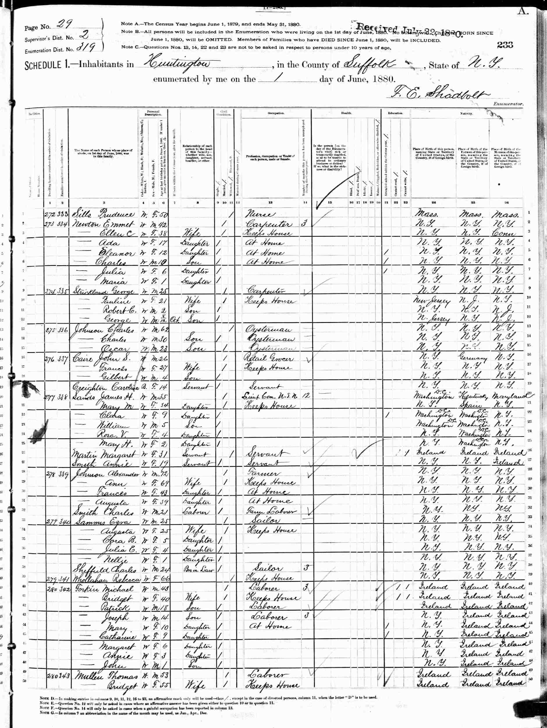 June 1, 1880 - Supervisor's District 2, Enumeration District 319, Huntington, Suffolk County, New York.