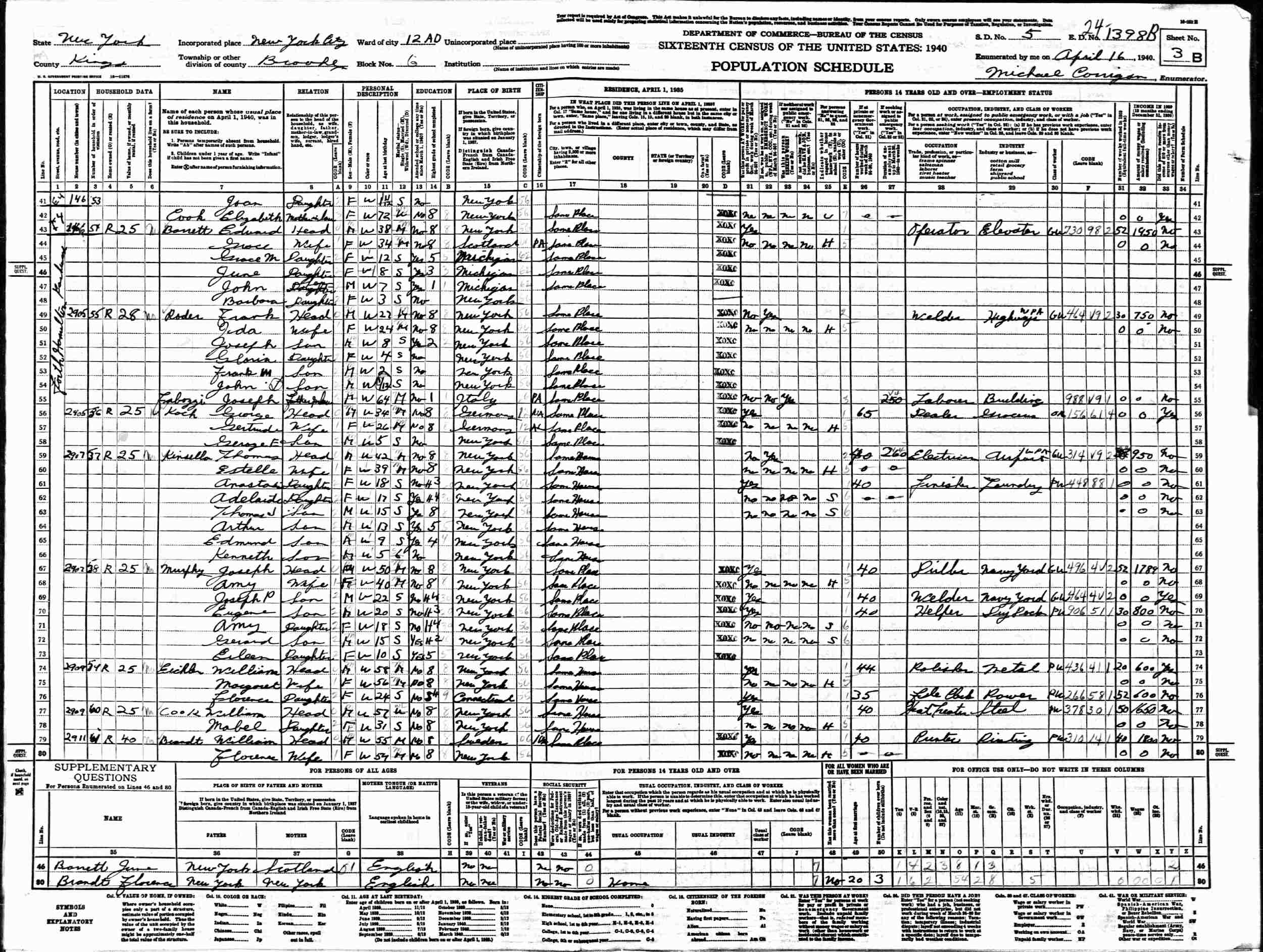 April 16, 1940 - 2907 Fort Hamilton Parkway, Assembly District 12, Block G, Supervisor's District 5, Enumeration District 24-1398B, Brooklyn, Kings County, New York.