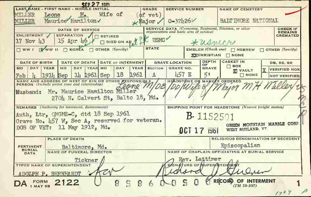 Buried: September 18, 1961 in Section A, Site 457E, Baltimore National Cemetery, Baltimore City, Maryland.
