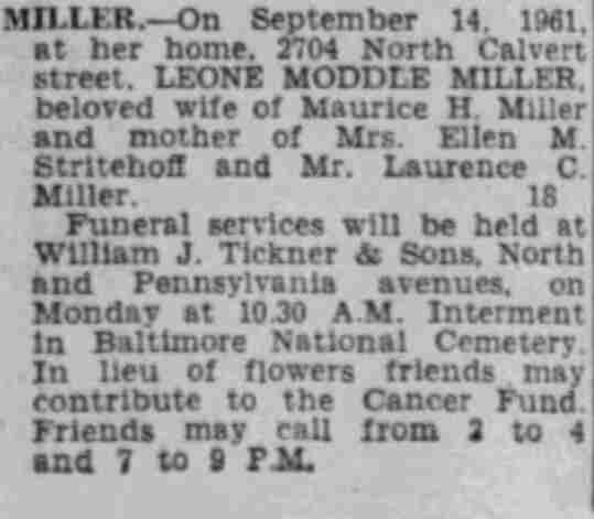 Died: September 14, 1961 in at home in Baltimore City, Maryland.