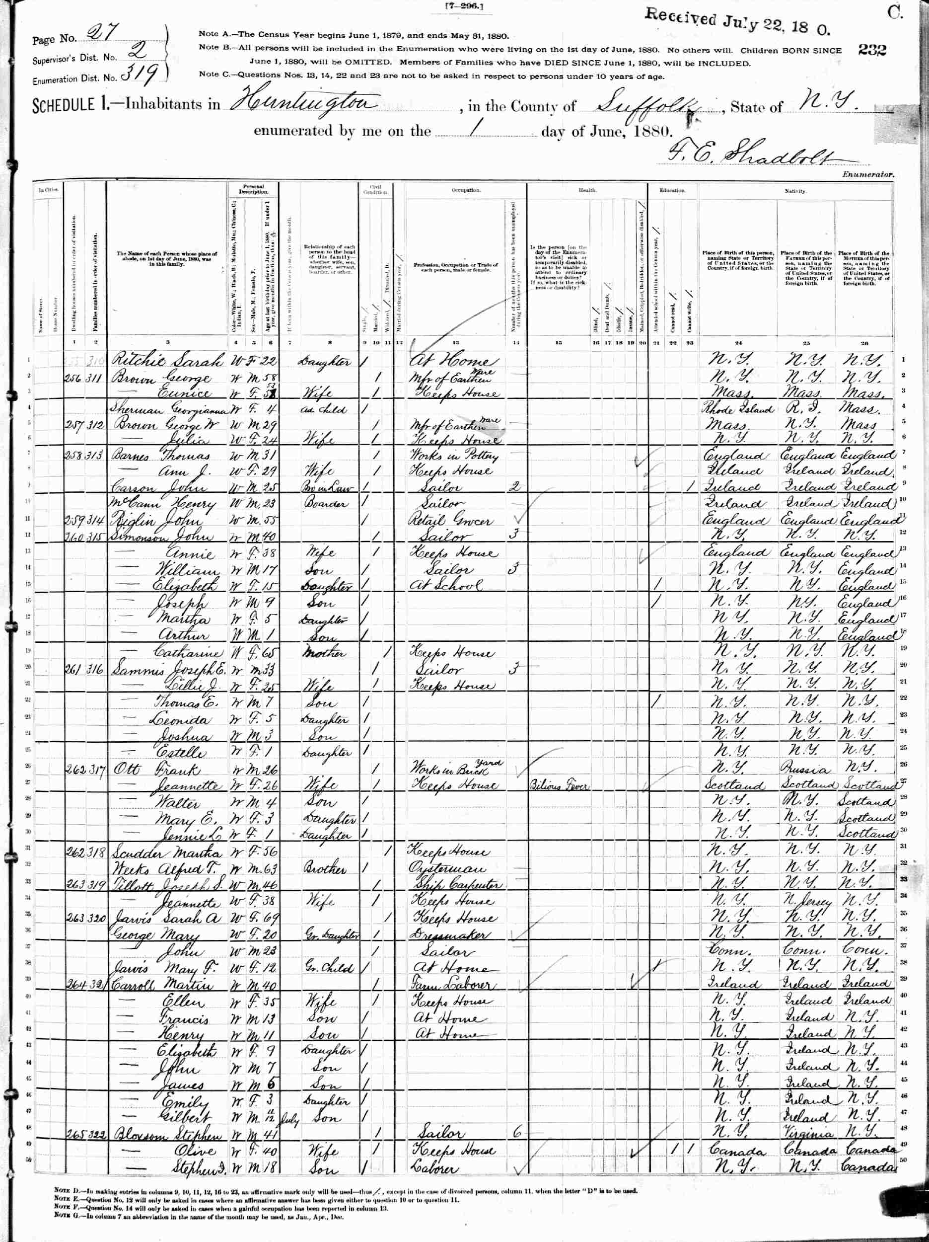 June 1, 1880 - Supervisor's District 2, Enumeration District 319, Huntington, Suffolk County, New York.