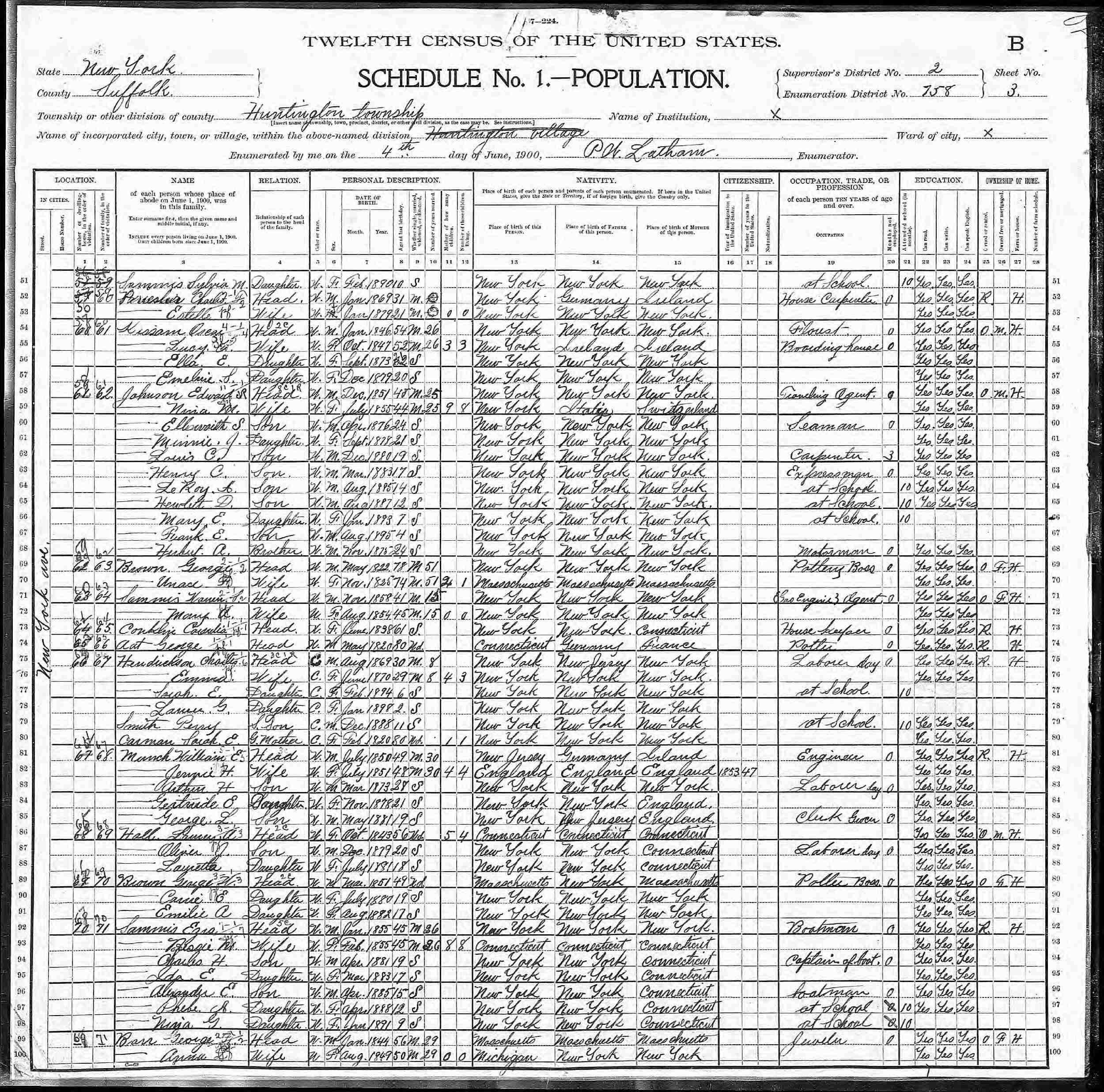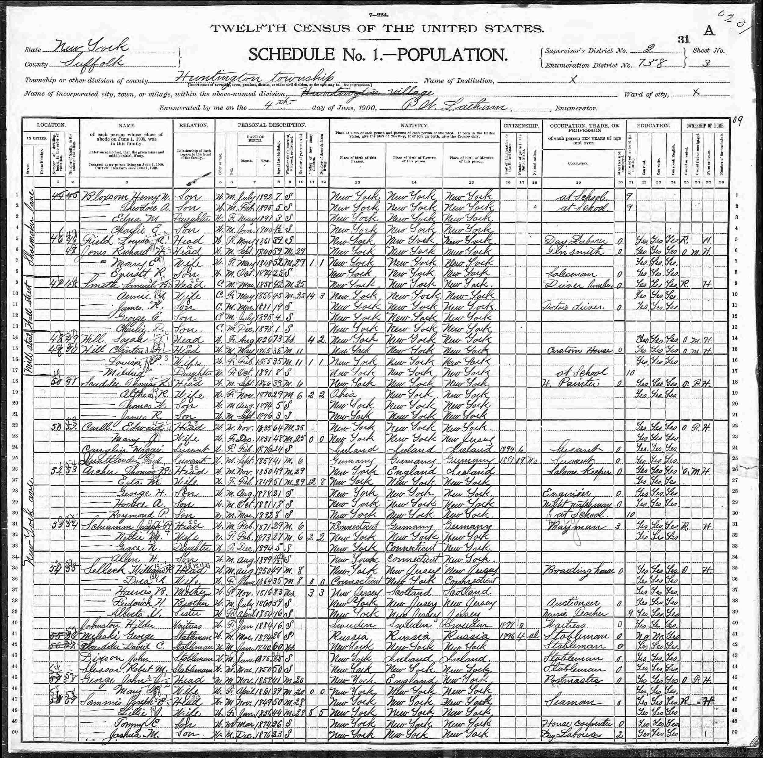 June 4, 1900 - New York Avenue, Supervisor's District 2, Enumeration District 758, Huntington, Suffolk County, New York.