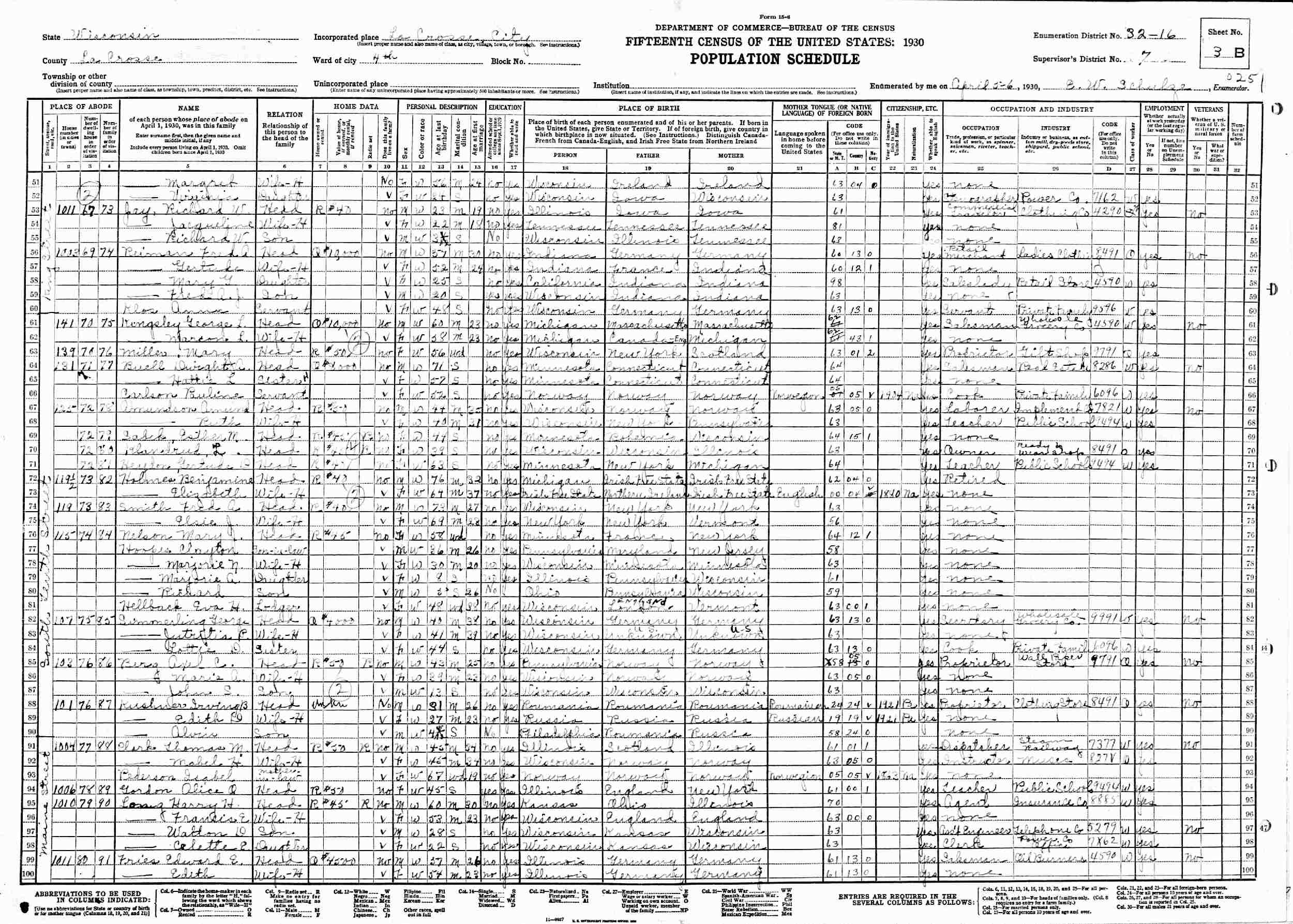 April 5-6, 1930 - 115 South Tenth Street, Ward 4, Supervisor's District 7, Enumeration District 32-16, LaCrosse, LaCrosse County, Wisconsin (w/maternal grandmother).
