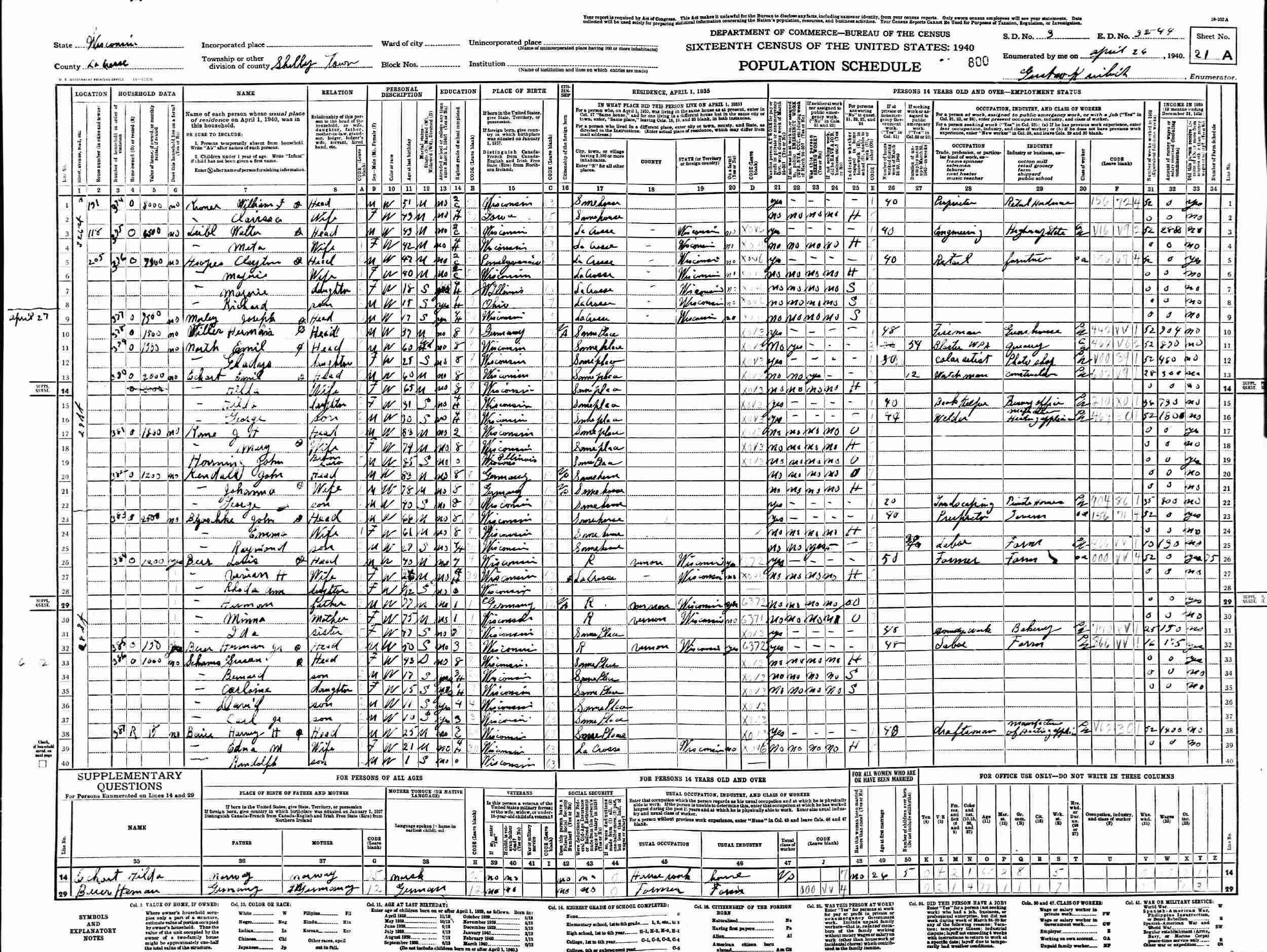 April 26, 1940 - 205 South 26th Street, Supervisor's District 3, Enumeration District 32-44, Shelby Town, LaCrosse County, Wisconsin.