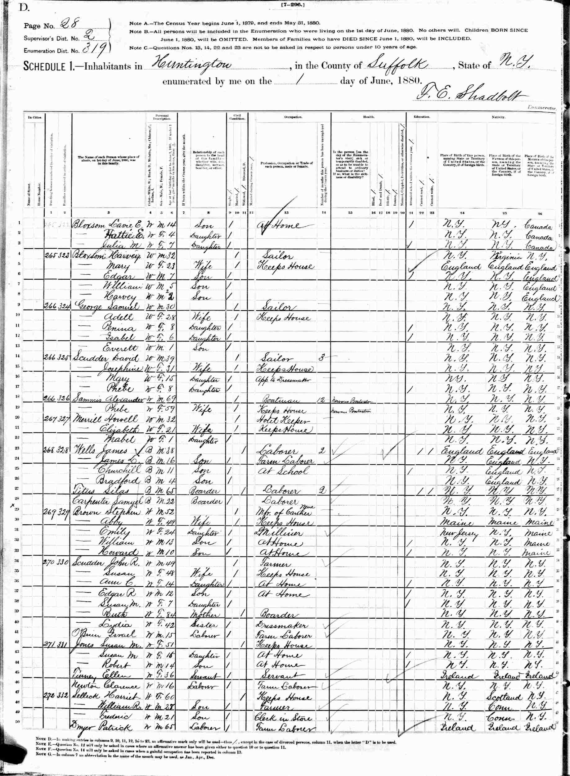 June 1, 1880 - Supervisor's District 2, Enumeration District 319, Huntington, Suffolk County, New York.
