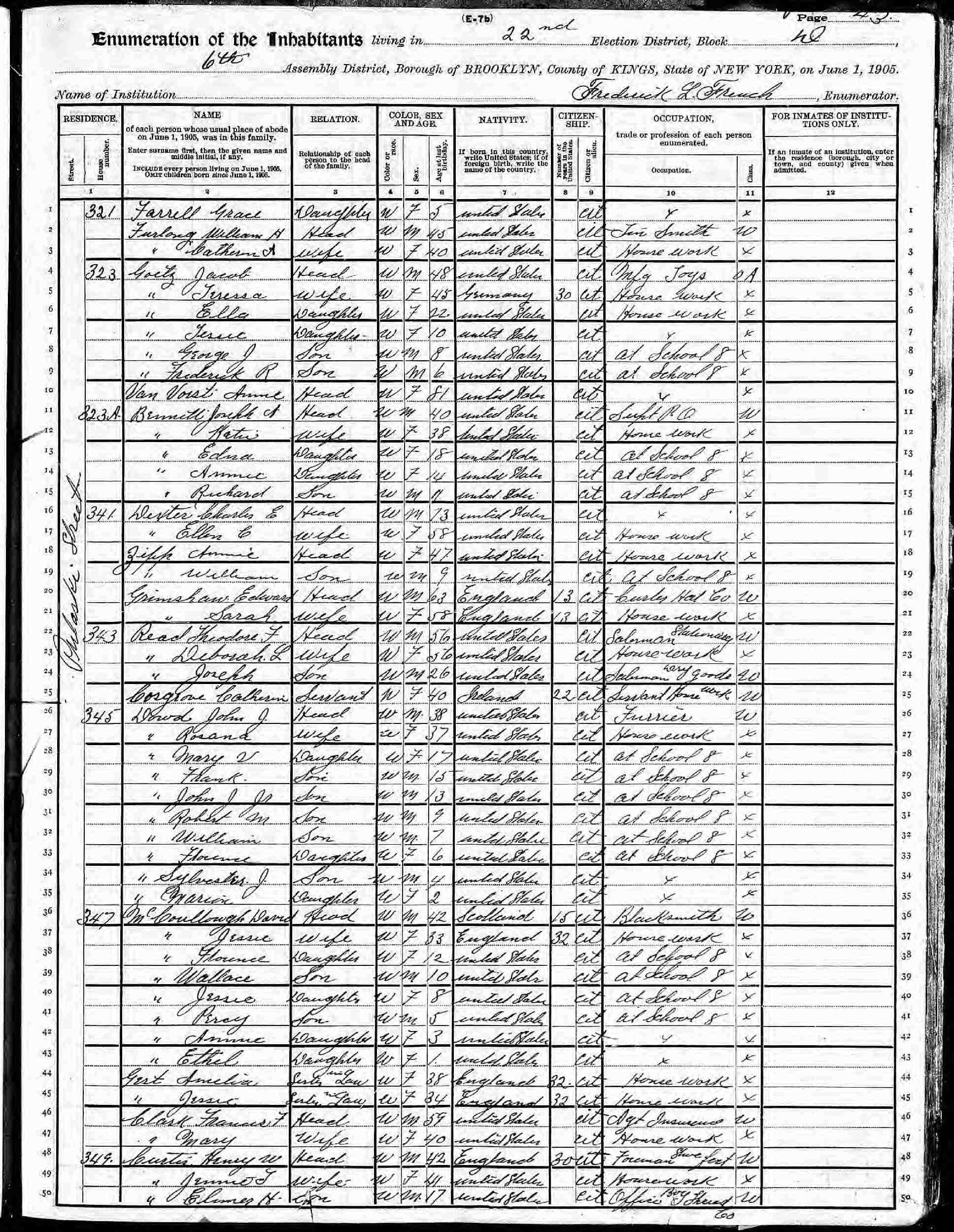 June 1, 1905 - New York State - 347 Pulaski Street, Election District 22, Block D, Assembly District 6, Brooklyn, Kings County, New York.