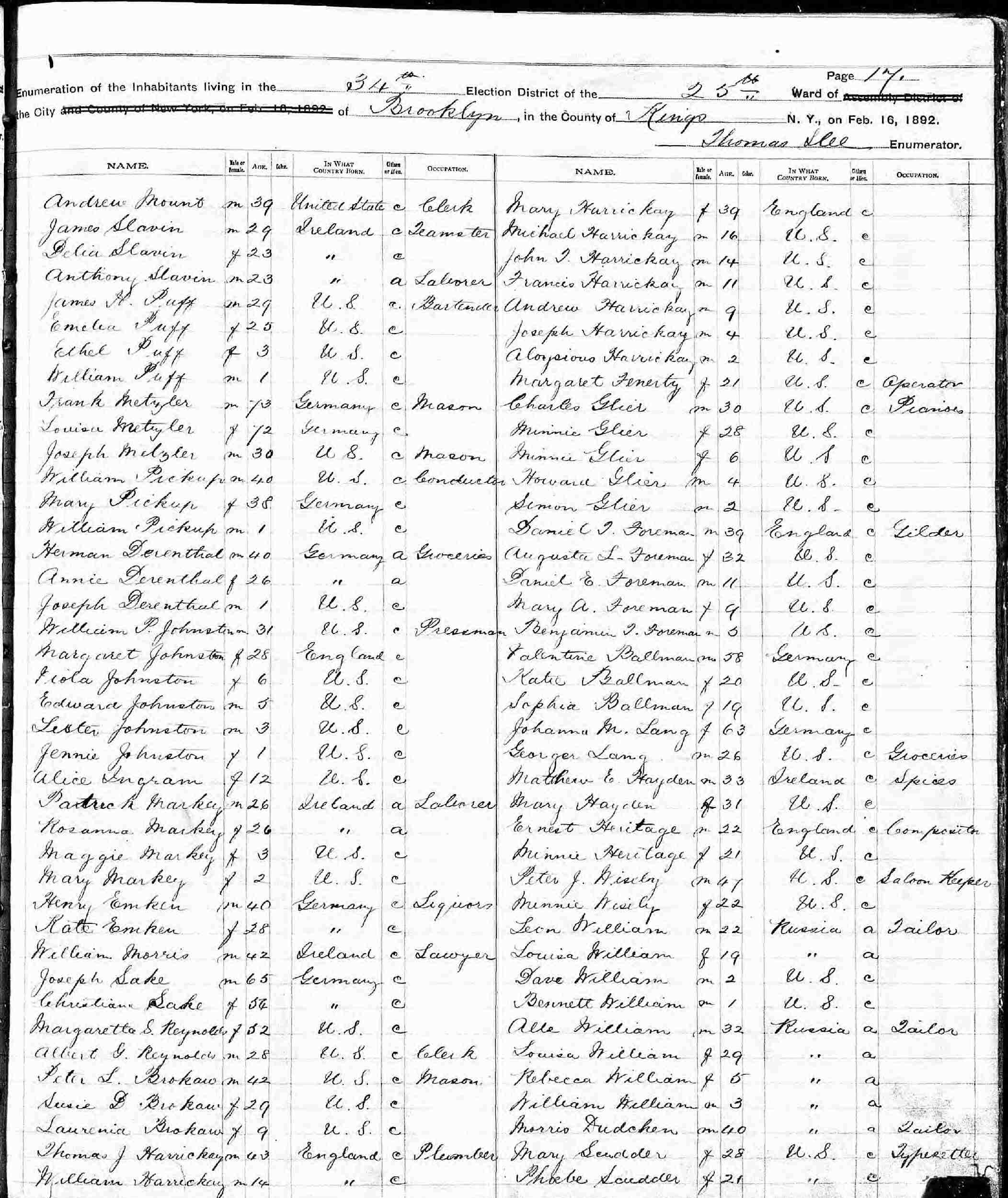 February 16, 1892 - Election District 34, Ward 25, Brooklyn, Kings County, New York.