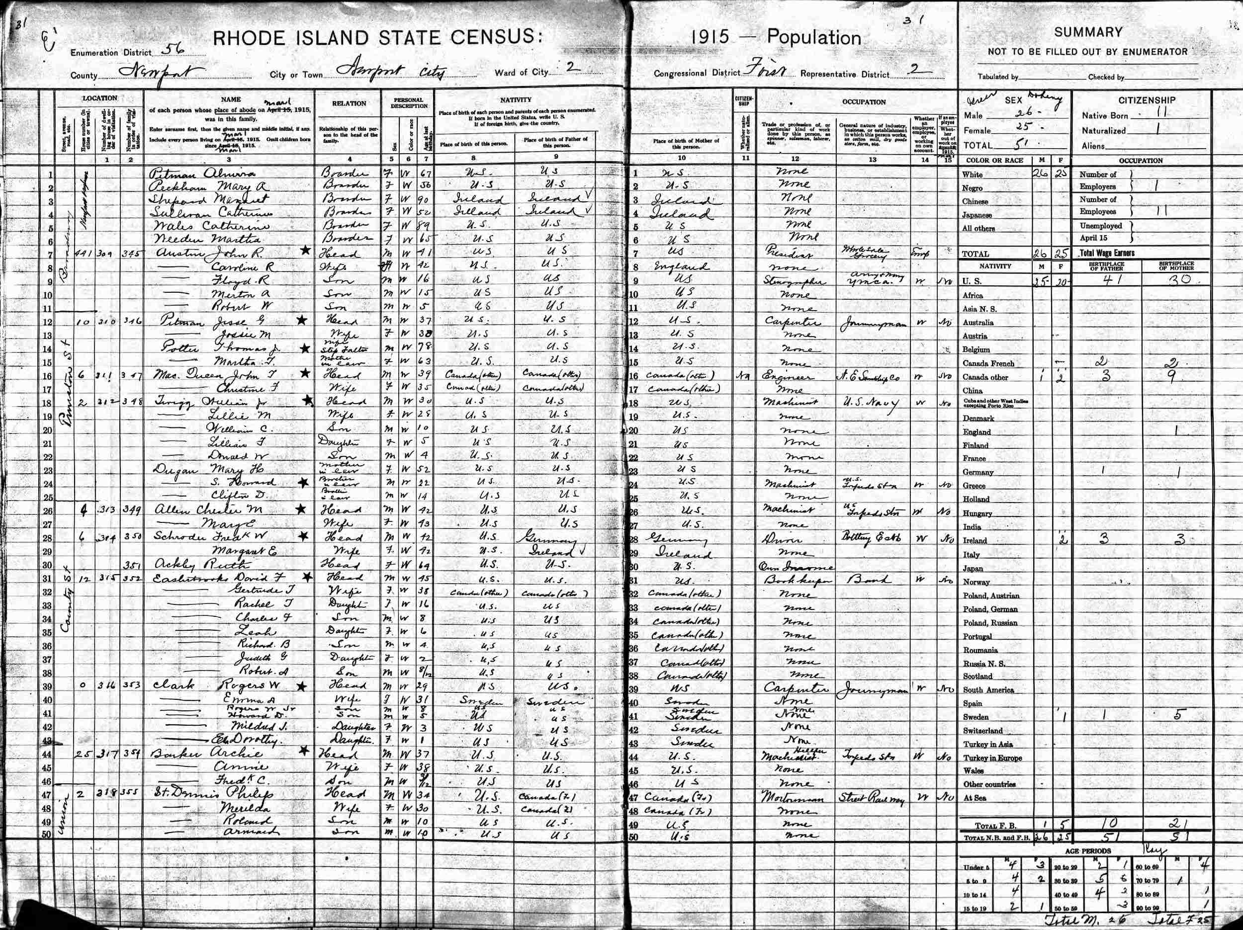 1915 - Rhode Island State Census - County Street, Enumeration District 56, Ward 2, Congressional District 1, Representative District 2, Newport City, Newport County, Rhode Island.