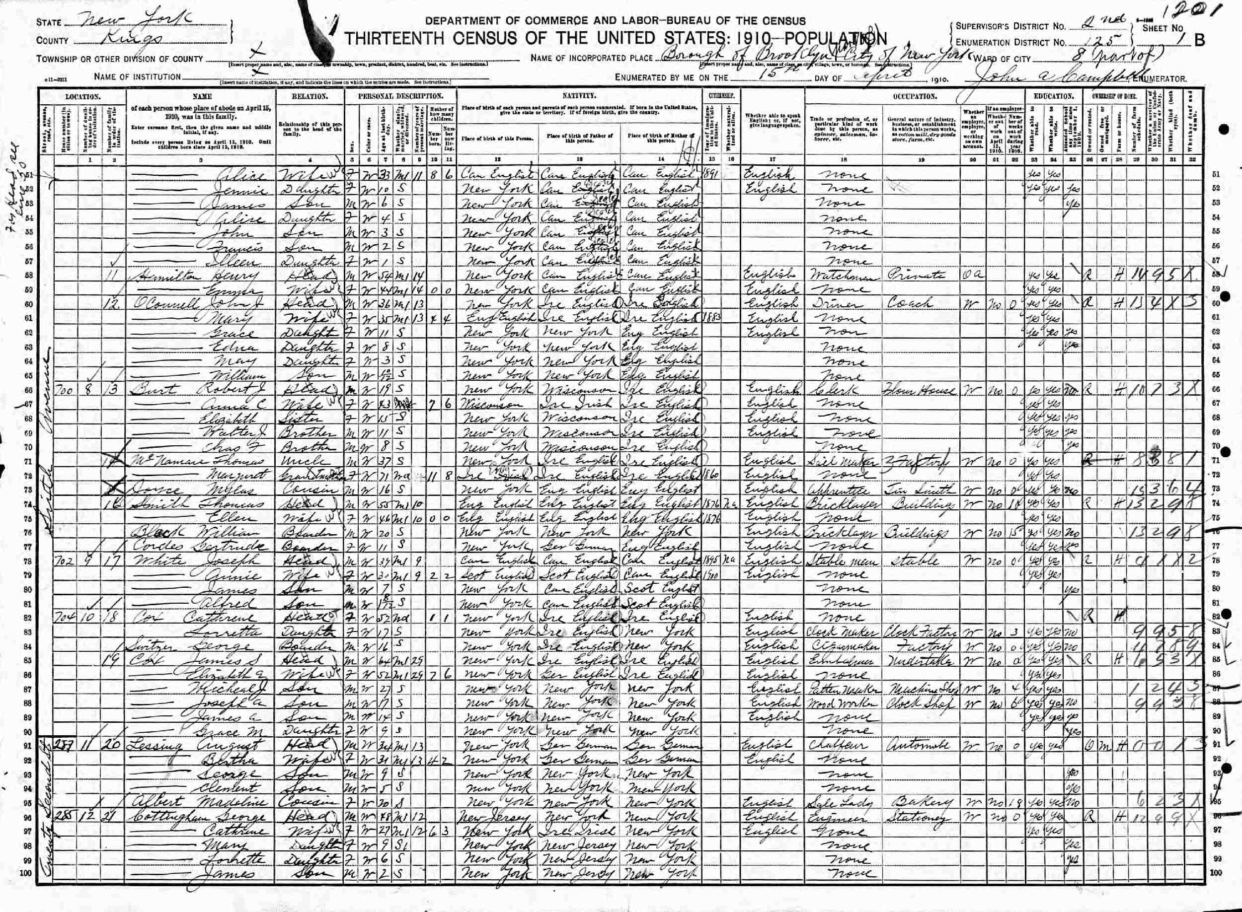 April 15, 1910 - 700 Smith Avenue, Ward 8, Supervisor's District 2, Enumeration District 125, Brooklyn, Kings County, New York (w/cousin Robert J Burt and maternal grandmother).