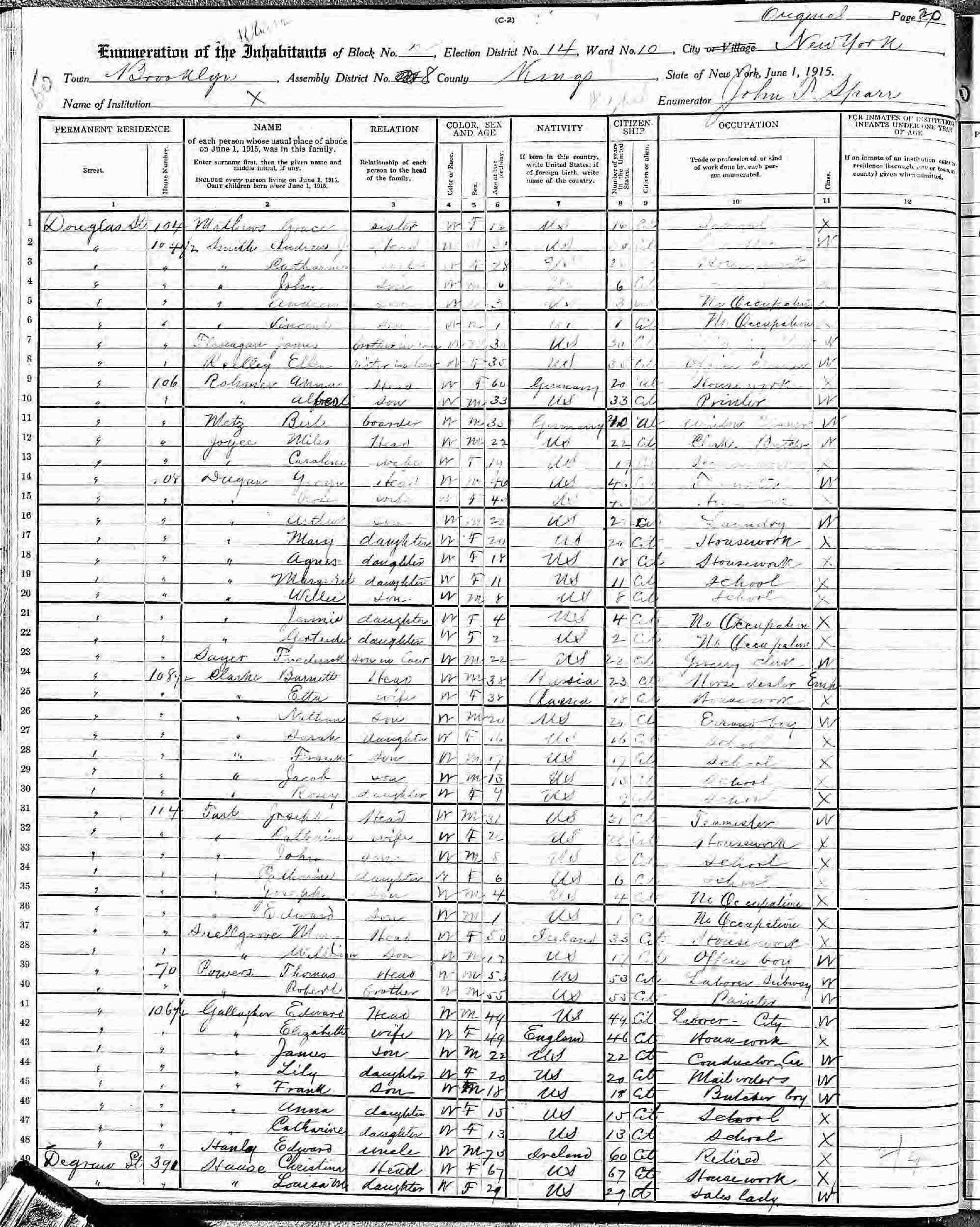 June 1, 1915 - New York State - 106 Douglas Street, Election District 14, Ward 10, Assembly District 8, Brooklyn, Kings County, New York.