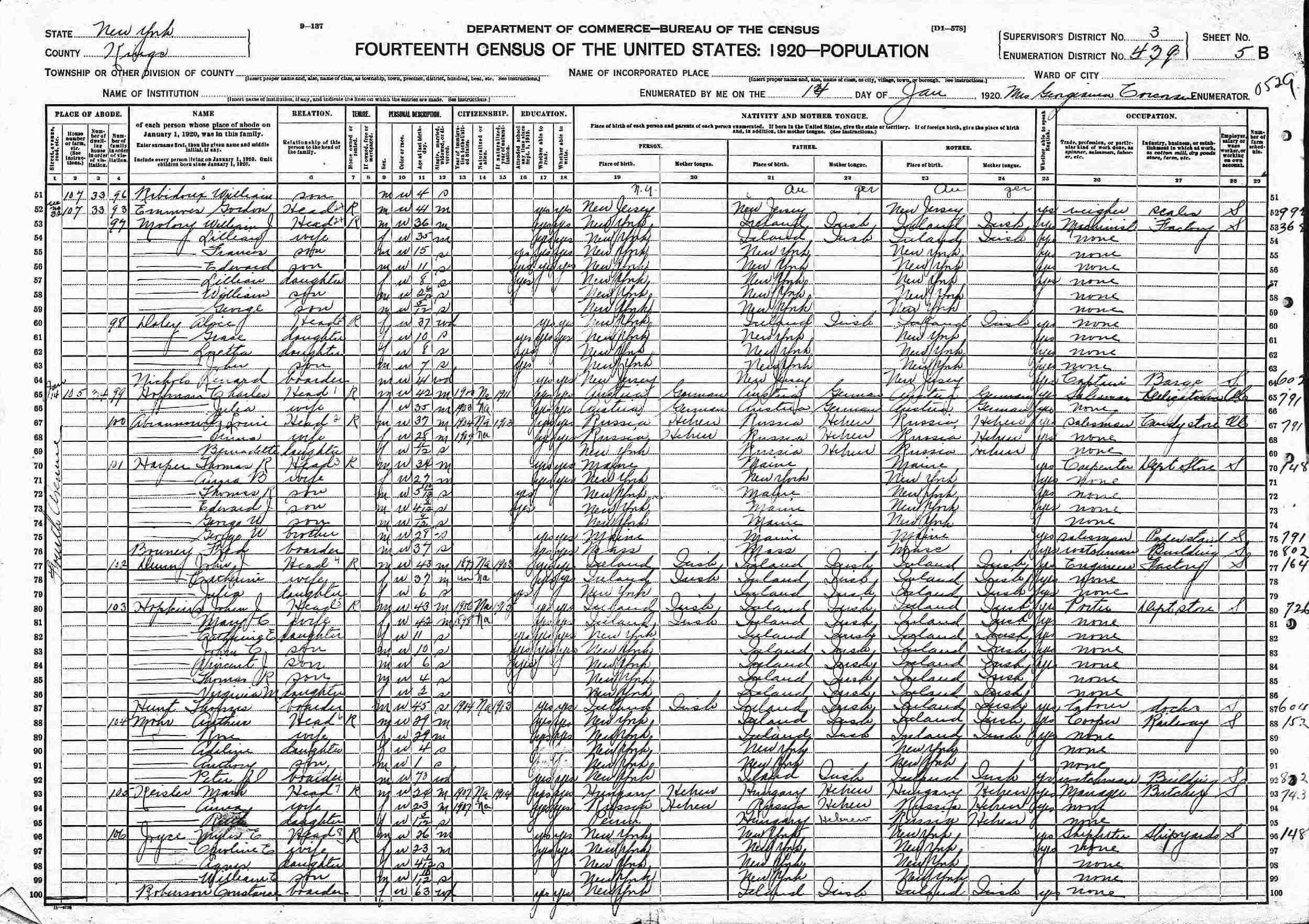 January 14, 1920 - 105 Fourth Avenue, Supervisor's District 3, Enumeration District 439, Brooklyn, Kings County, New York.