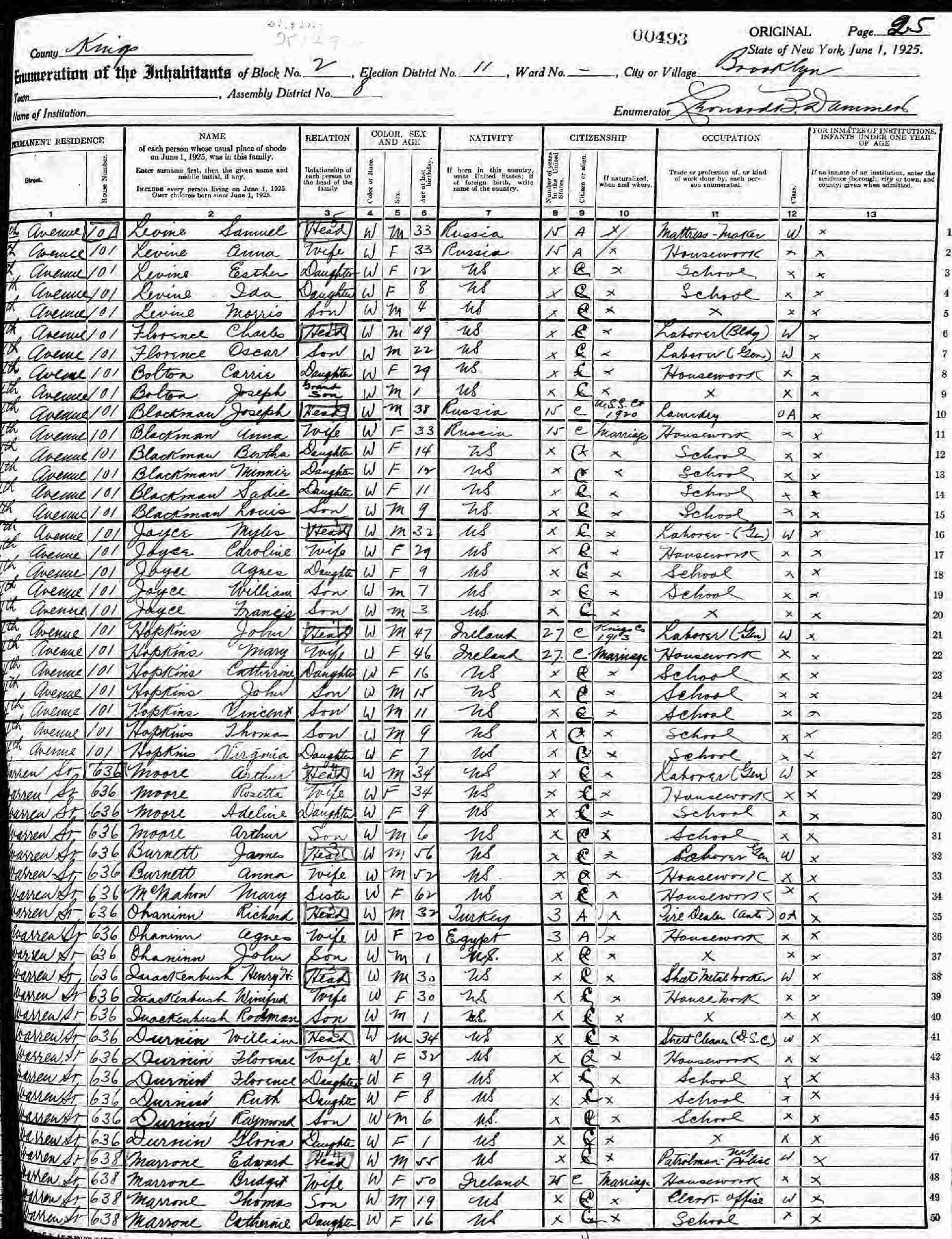 June 1, 1925 - New York State - 101 4th Avenue, Block 2, Election District 11, Assembly District 8, Brooklyn, Kings County, New York.
