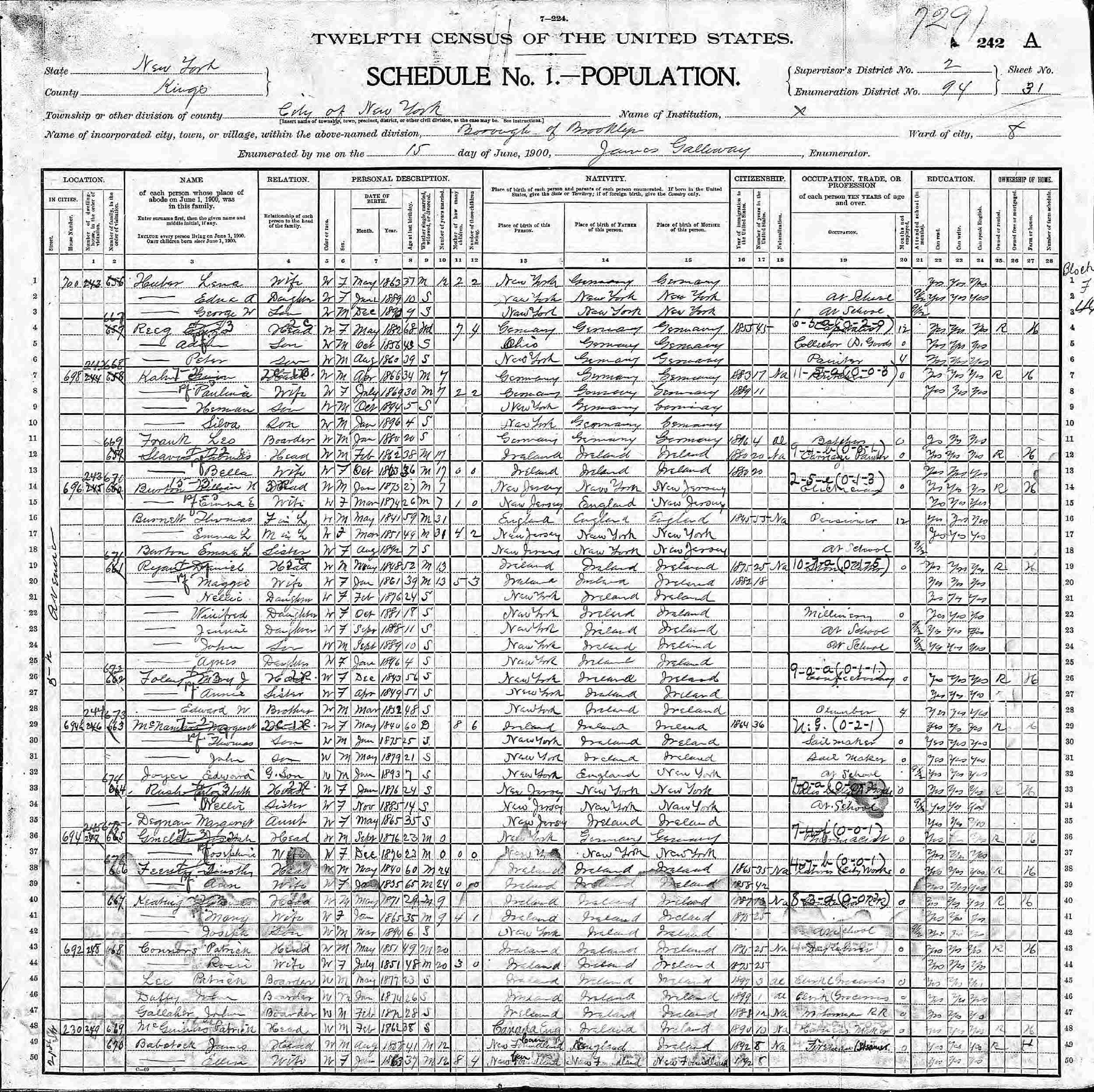 June 15, 1900 - 694 1/2 5th Avenue, Ward 8, Supervisor's District 2, Enumeration District 94, Brooklyn, Kings County, New York (w/maternal grandmother)